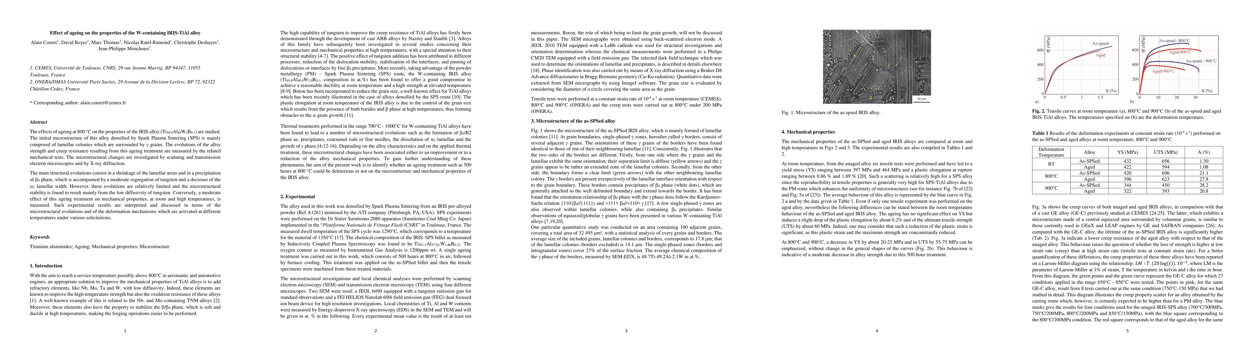 The effects of ageing at 800 $^\circ$C on the properties of the IRIS alloy (Ti$_{49.9}$Al$_{48}$W$_2$B$_{0.1}$) are studied. The initial microstructure of this alloy densified by Spark Plasma Sintering (SPS) is mainly composed of lamellar colonies which are surrounded by $\gamma$ grains. The evolutions of the alloy strength and creep resistance resulting from this ageing treatment are measured by the related mechanical tests. The microstructural changes are investigated by scanning and transmission electron microscopies and by X-ray diffraction. The main structural evolutions consist in a shrinkage of the lamellar areas and in a precipitation of $\beta_0$ phase, which is accompanied by a moderate segregation of tungsten and a decrease of the $\alpha_2$ lamellar width. However, these evolutions are relatively limited and the microstructural stability is found to result mainly from the low diffusivity of tungsten. Conversely, a moderate effect of this ageing treatment on mechanical properties, at room and high temperatures, is measured. Such experimental results are interpreted and discussed in terms of the microstructural evolutions and of the deformation mechanisms which are activated at different temperatures under various solicitations.