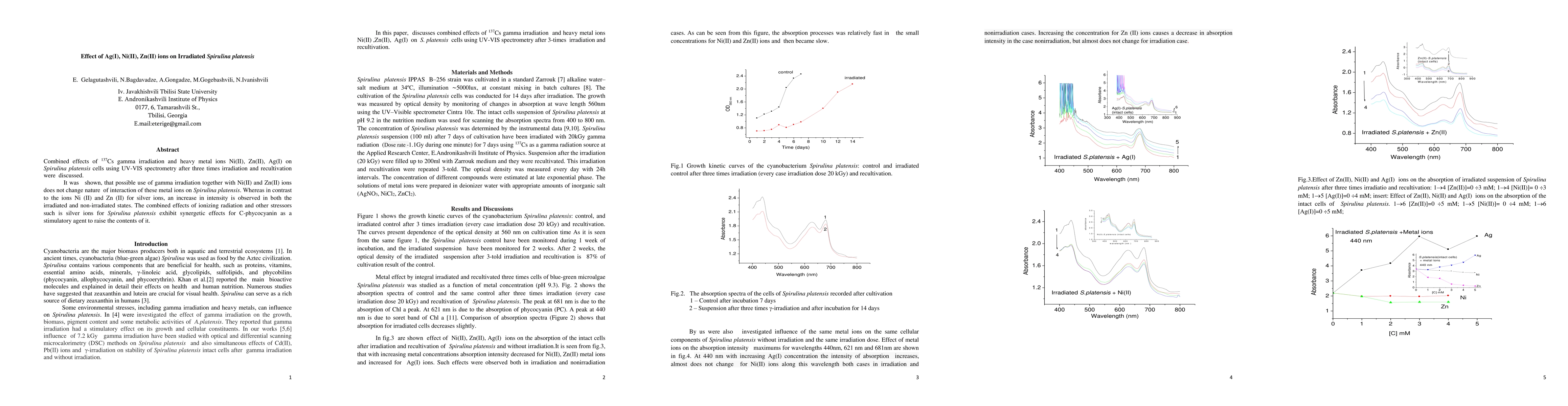 Combined effects of 137Cs gamma irradiation and heavy metal ions Ni(II), Zn(II), Ag(I) on Spirulina platensis cells using UV-VIS spectrometry after three times irradiation and recultivation were discussed. It was shown, that possible use of gamma irradiation together with Ni(II) and Zn(II) ions does not change nature of interaction of these metal ions on Spirulina platensis. Whereas in contrast to the ions Ni (II) and Zn (II) for silver ions, an increase in intensity is observed in both the irradiated and non-irradiated states. The combined effects of ionizing radiation and other stressors such is silver ions for Spirulina platensis exhibit synergetic effects for C-phycocyanin as a stimulatory agent to raise the contents of it.