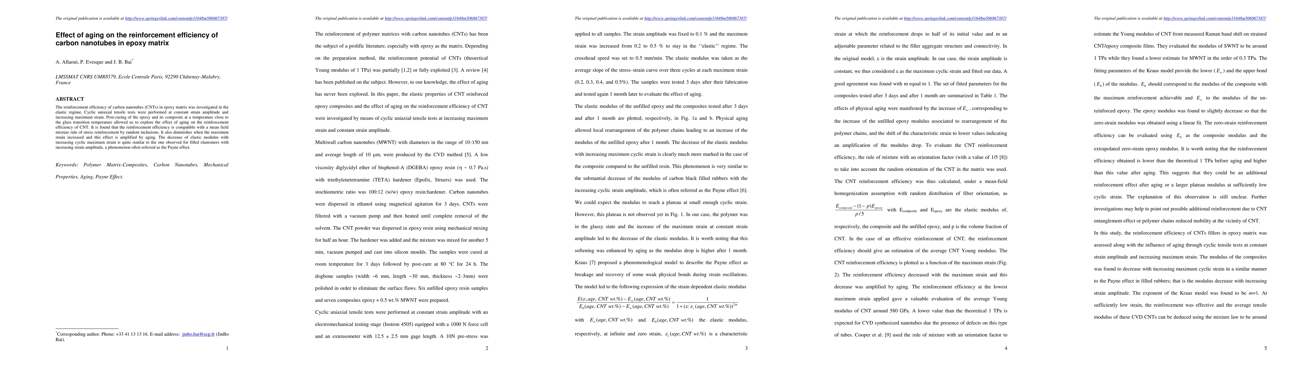 The reinforcement efficiency of carbon nanotubes (CNTs) in epoxy matrix was investigated in the elastic regime. Cyclic uniaxial tensile tests were performed at constant strain amplitude and increasing maximum strain. Post-curing of the epoxy and its composite at a temperature close to the glass transition temperature allowed us to explore the effect of aging on the reinforcement efficiency of CNT. It is found that the reinforcement efficiency is compatible with a mean field mixture rule of stress reinforcement by random inclusions. It also diminishes when the maximum strain increased and this effect is amplified by aging. The decrease of elastic modulus with increasing cyclic maximum strain is quite similar to the one observed for filled elastomers with increasing strain amplitude, a phenomenon often referred as the Payne effect.
