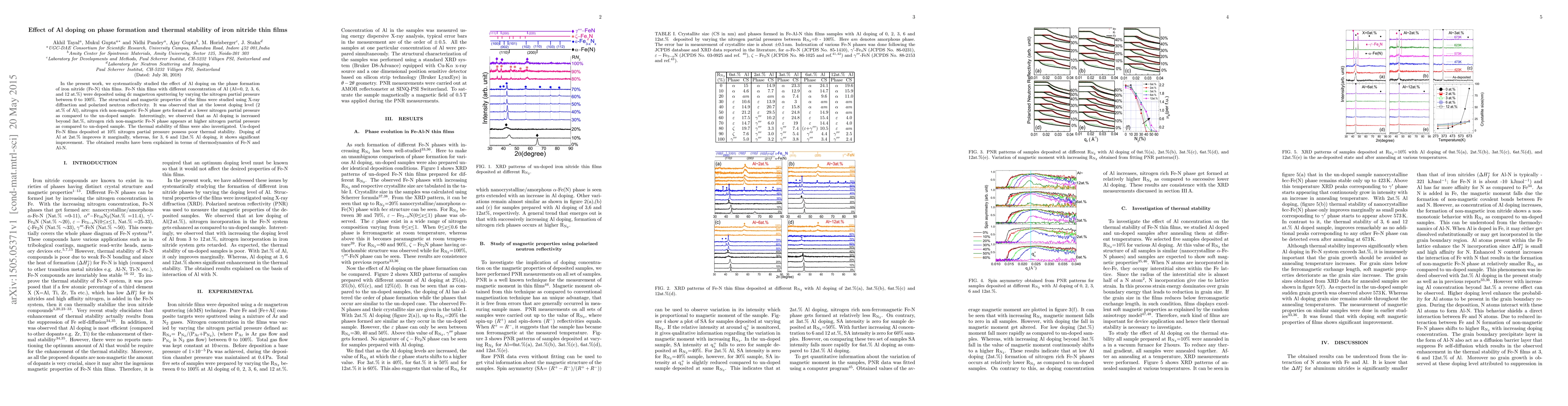 This study investigates the impact of Al doping on the phase formation and thermal stability of iron nitride thin films deposited via dc magnetron sputtering. Al doping at 2 at.% promotes the formation of nitrogen-rich non-magnetic Fe-N phase at lower nitrogen partial pressures, while higher doping levels (beyond 3 at.%) shift this phase to higher nitrogen partial pressures. Thermal stability improves significantly with Al doping, especially at concentrations above 3 at.%, attributed to thermodynamic effects of Fe-N and Al-N interactions.