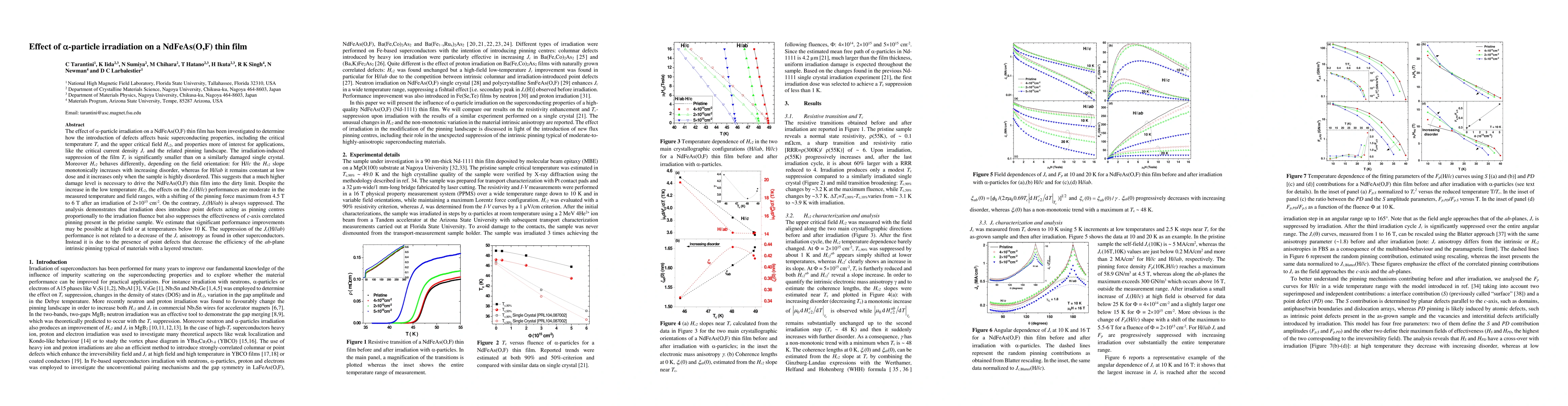 Alpha-particle irradiation affects NdFeAs(O,F) thin film properties, introducing point defects that suppress critical current density but show promise for high-field or low-temperature applications.