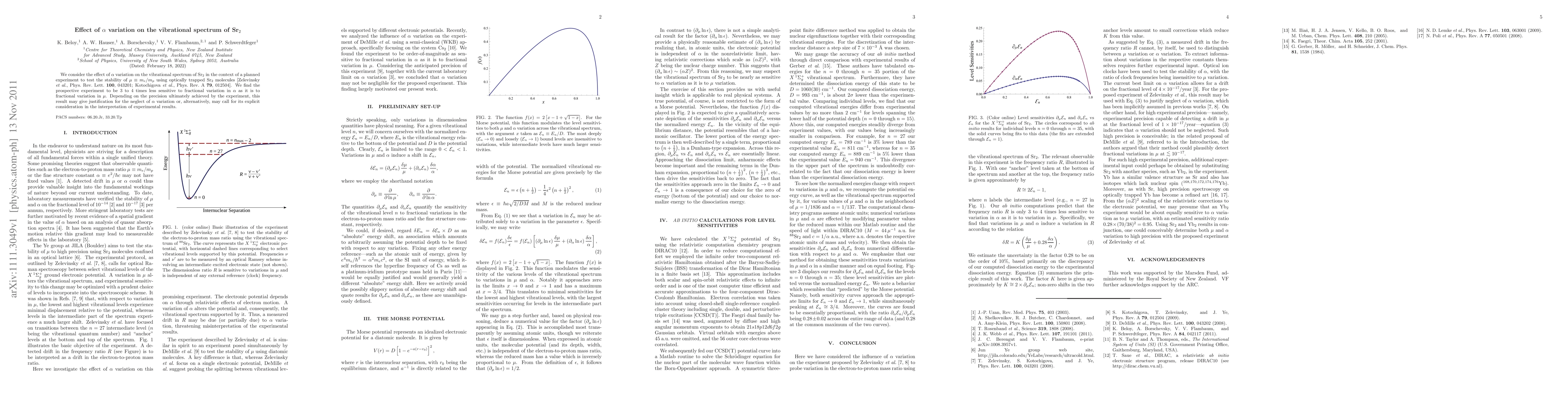 We consider the effect of $\alpha$ variation on the vibrational spectrum of Sr$_2$ in the context of a planned experiment to test the stability of $\mu\equiv m_e/m_p$ using optically trapped Sr$_2$ molecules [Zelevinsky et al., Phys. Rev. Lett. {\bf 100}, 043201; Kotochigova et al., Phys. Rev. A {\bf 79}, 012504]. We find the prospective experiment to be 3 to 4 times less sensitive to fractional variation in $\alpha$ as it is to fractional variation in $\mu$. Depending on the precision ultimately achieved by the experiment, this result may give justification for the neglect of $\alpha$ variation or, alternatively, may call for its explicit consideration in the interpretation of experimental results.