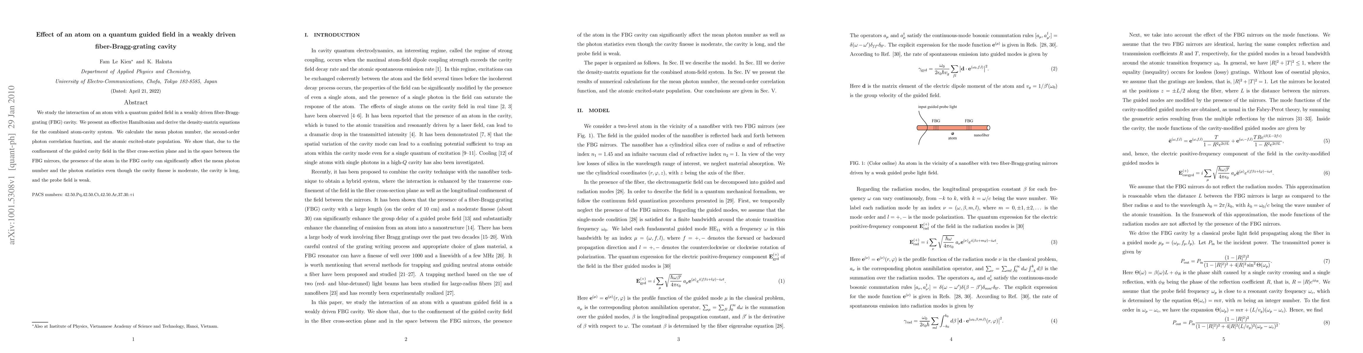 We study the interaction of an atom with a quantum guided field in a weakly driven fiber-Bragg-grating (FBG) cavity. We present an effective Hamiltonian and derive the density-matrix equations for the combined atom-cavity system. We calculate the mean photon number, the second-order photon correlation function, and the atomic excited-state population. We show that, due to the confinement of the guided cavity field in the fiber cross-section plane and in the space between the FBG mirrors, the presence of the atom in the FBG cavity can significantly affect the mean photon number and the photon statistics even though the cavity finesse is moderate, the cavity is long, and the probe field is weak.