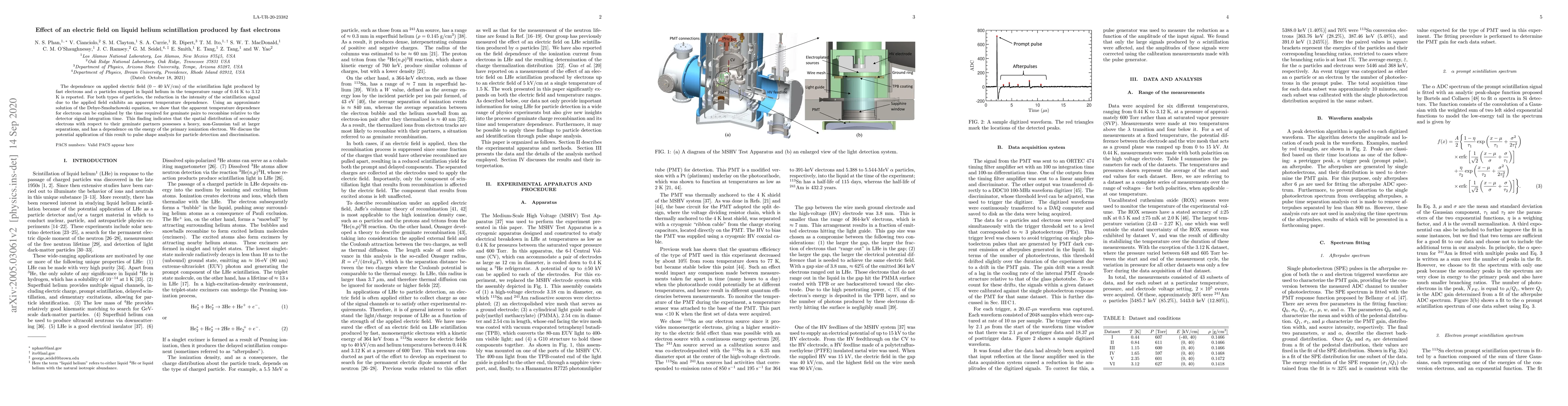 This study investigates how an applied electric field affects scintillation light from fast electrons and alpha particles in liquid helium. The results show a temperature-dependent reduction in scintillation intensity, explained by the recombination time of geminate electron pairs, indicating a non-Gaussian spatial distribution and potential applications in particle detection discrimination.
