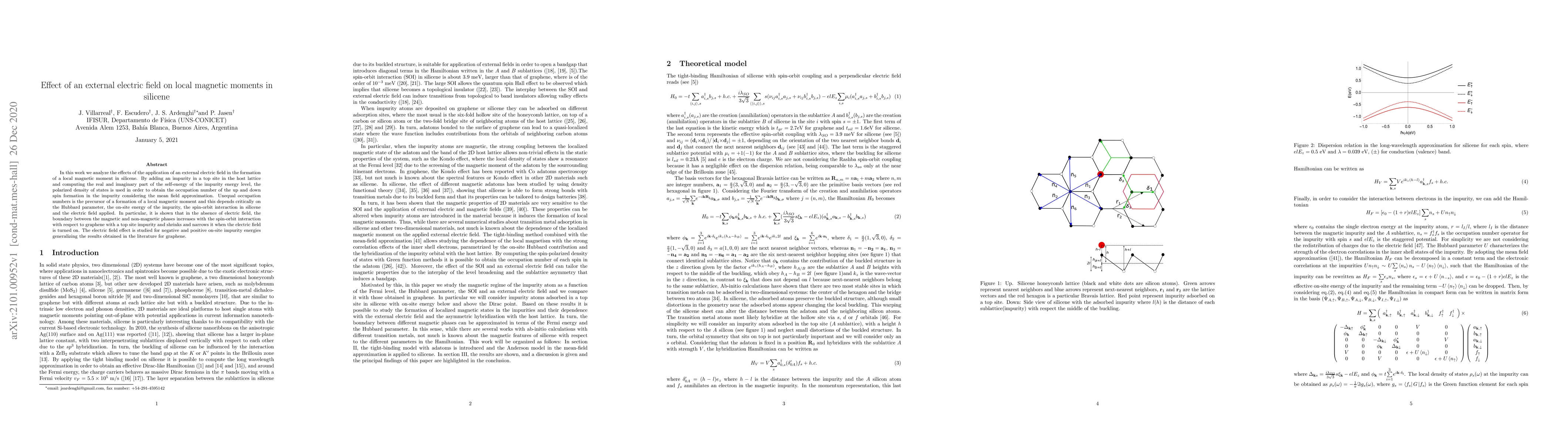 In this work we analyze the effects of the application of an external electric field in the formation of a local magnetic moment in silicene. By adding an impurity in a top site in the host lattice and computing the real and imaginary part of the self-energy of the impurity energy level, the polarized density of states is used in order to obtain the occupation number of the up and down spin formation in the impurity considering the mean field approximation. Unequal occupation numbers is the precursor of a formation of a local magnetic moment and this depends critically on the Hubbard parameter, the on-site energy of the impurity, the spin-orbit interaction in silicene and the electric field applied. In particular, it is shown that in the absence of electric field, the boundary between the magnetic and non-magnetic phases increases with the spin-orbit interaction with respect to graphene with a top site impurity and shrinks and narrows it when the electric field is turned on. The electric field effect is studied for negative and positive on-site impurity energies generalizing the results obtained in the literature for graphene.