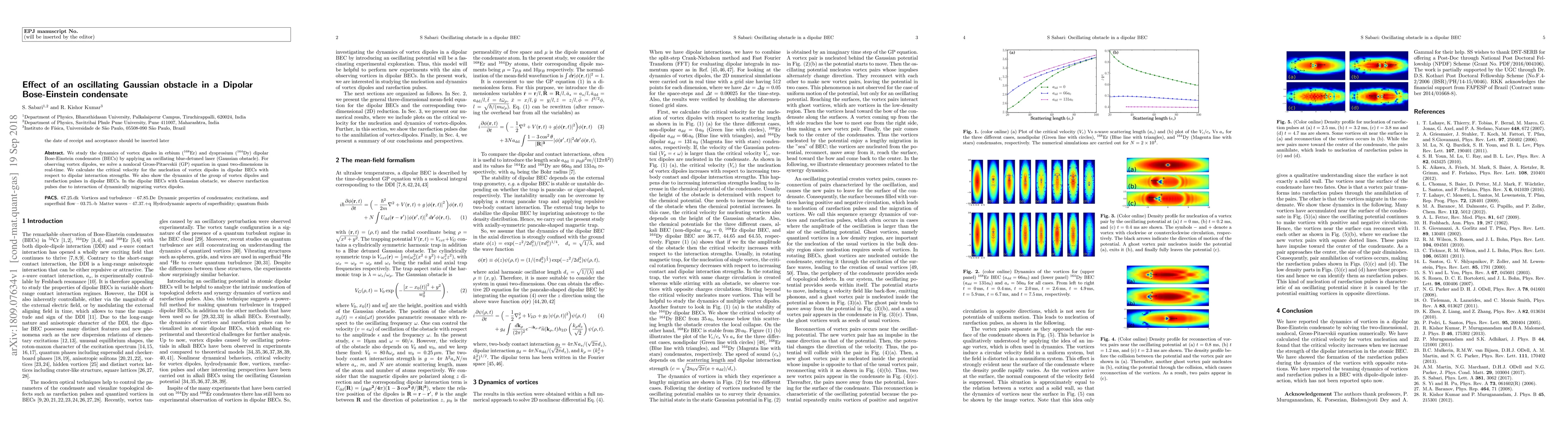 Researchers studied vortex dipoles in dipolar Bose-Einstein condensates with an oscillating Gaussian obstacle, finding critical velocities for their formation and observing rarefaction pulses due to dynamic interactions.
