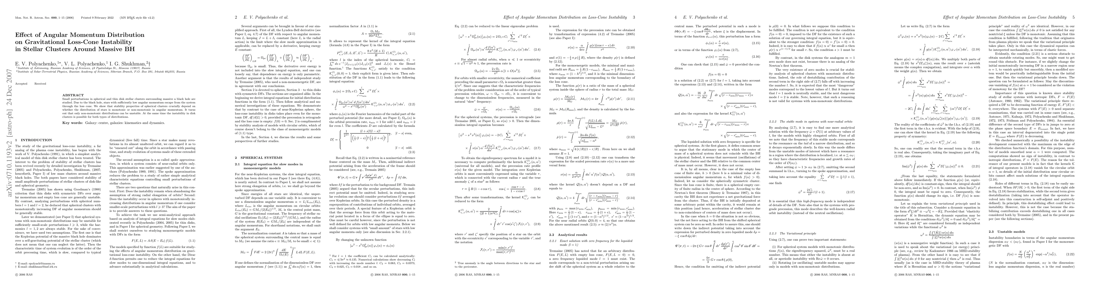 This paper investigates the gravitational loss-cone instability in stellar clusters around a massive black hole, finding that spherical clusters with non-monotonic angular momentum distributions exhibit instability, while disk clusters can be unstable regardless of angular momentum distribution.