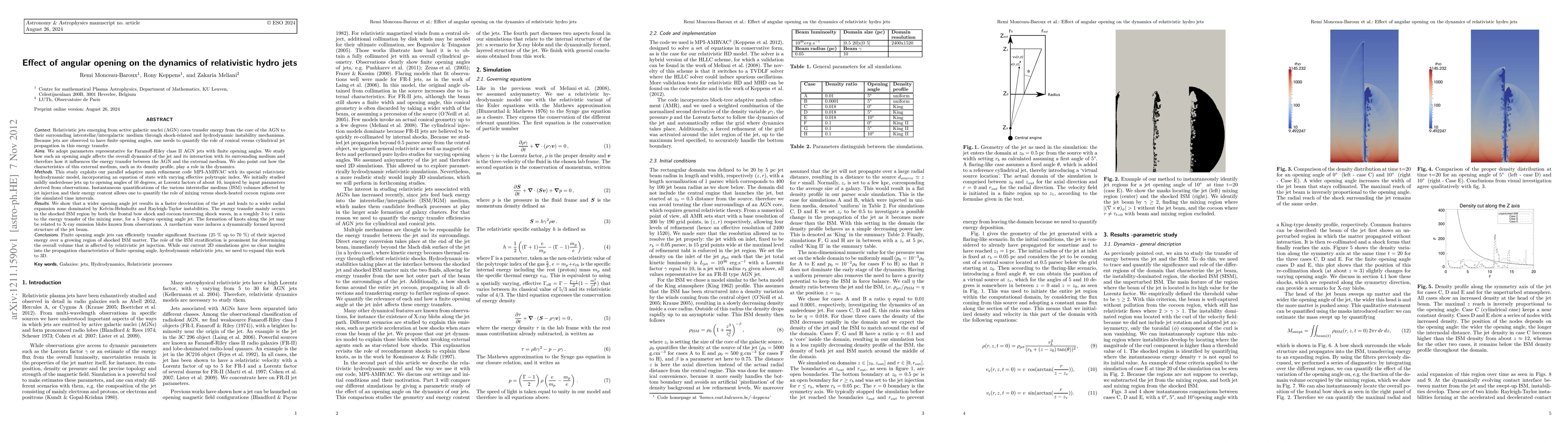 This study investigates how relativistic jets from AGN with finite opening angles affect their dynamics and energy transfer. Results show that wider jets decelerate faster and create larger cocoons dominated by instabilities, with energy transfer predominantly occurring in the shocked ISM region.