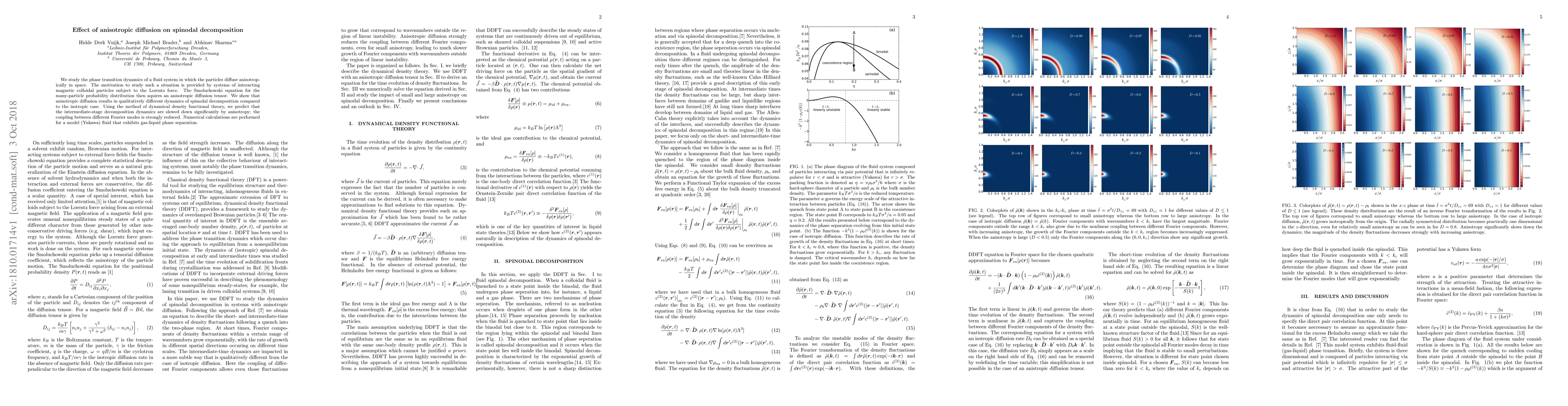 This paper investigates the dynamics of spinodal decomposition in fluid systems where particles diffuse anisotropically, motivated by magnetic colloidal particles under Lorentz force. It finds that anisotropic diffusion significantly slows down intermediate-stage decomposition and reduces coupling between Fourier modes, contrasting with isotropic diffusion.