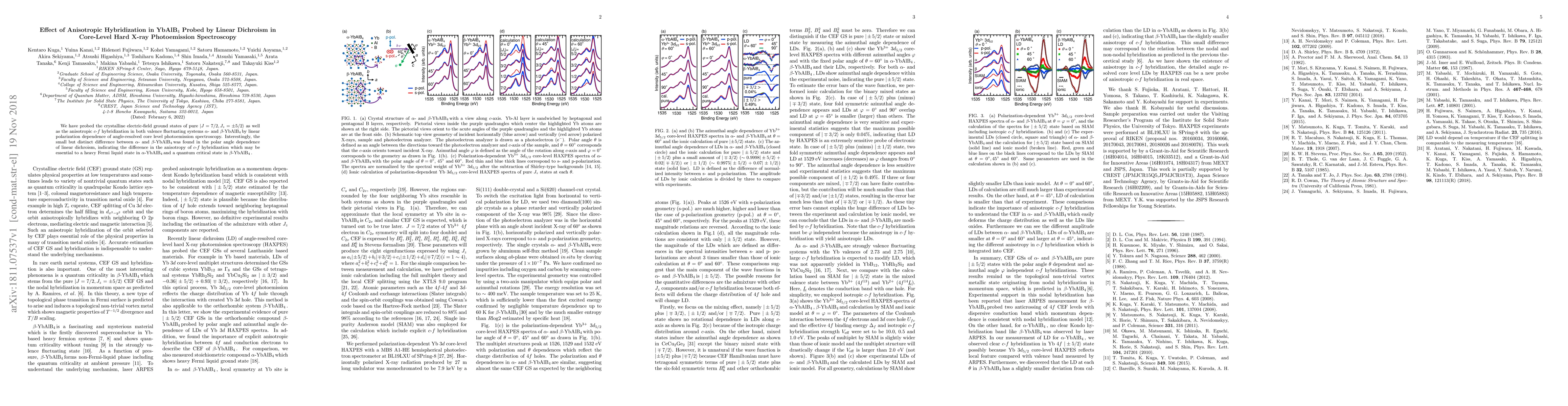 We have probed the crystalline electric-field ground states of pure $|J = 7/2, J_z = \pm 5/2\rangle$ as well as the anisotropic $c$-$f$ hybridization in both valence fluctuating systems $\alpha$- and $\beta$-YbAlB$_4$ by linear polarization dependence of angle-resolved core level photoemission spectroscopy. Interestingly, the small but distinct difference between \abyb was found in the polar angle dependence of linear dichroism, indicating the difference in the anisotropy of $c$-$f$ hybridization which may be essential to a heavy Fermi liquid state in $\alpha$-YbAlB$_4$ and a quantum critical state in $\beta$-YbAlB$_4$.