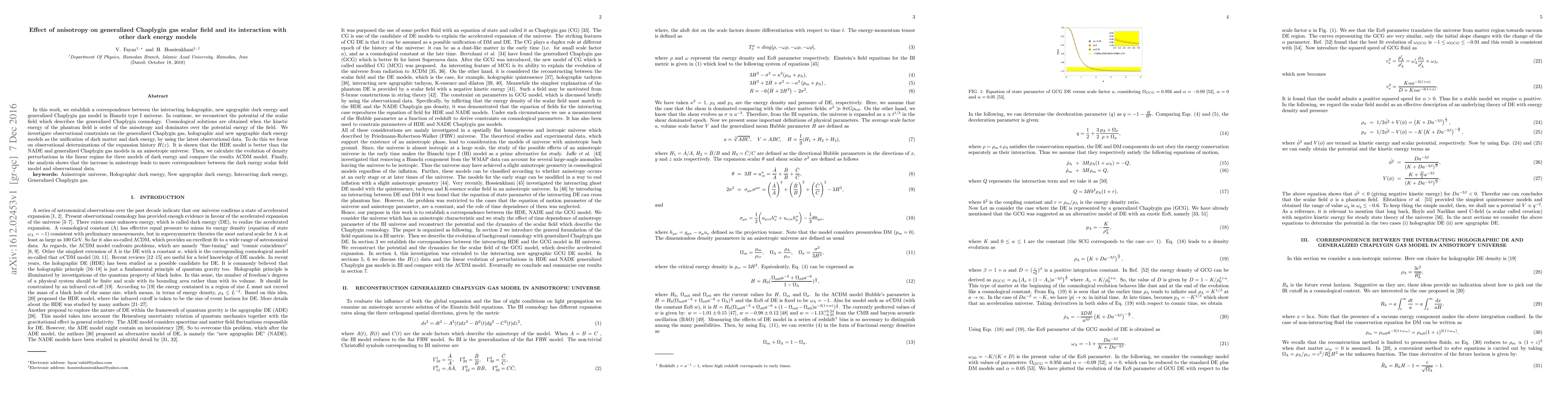 In this work, we establish a correspondence between the interacting holographic, new agegraphic dark energy and generalized Chaplygin gas model in Bianchi type I universe. In continue, we reconstruct the potential of the scalar field which describes the generalized Chaplygin cosmology. Cosmological solutions are obtained when the kinetic energy of the phantom field is order of the anisotropy and dominates over the potential energy of the field. We investigate observational constraints on the generalized Chaplygin gas, holographic and new agegraphic dark energy models as the unification of dark matter and dark energy, by using the latest observational data. To do this we focus on observational determinations of the expansion history $H(z)$. It is shown that the HDE model is better than the NADE and generalized Chaplygin gas models in an anisotropic universe. Then, we calculate the evolution of density perturbations in the linear regime for three models of dark energy and compare the results $\Lambda$CDM model. Finally, the analysis shows that the increase in anisotropy leads to more correspondence between the dark energy scalar field model and observational data