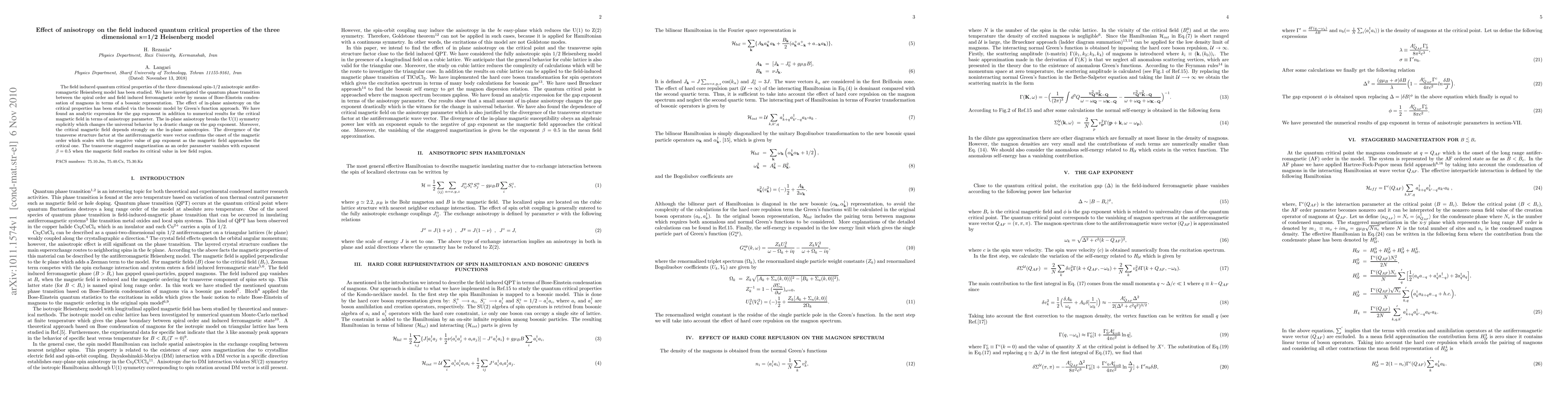 The field induced quantum critical properties of the three dimensional spin-1/2 anisotropic antiferromagnetic Heisenberg model has been studied. We have investigated the quantum phase transition between the spiral order and field induced ferromagnetic order by means of Bose-Einstein condensation of magnons in terms of a bosonic representation. The effect of in-plane anisotropy on the critical properties has been studied via the bosonic model by Green's function approach. We have found an analytic expression for the gap exponent in addition to numerical results for the critical magnetic field in terms of anisotropy parameter. The in-plane anisotropy breaks the U(1) symmetry explicitly which changes the universal behavior by a drastic change on the gap exponent. Moreover, the critical magnetic field depends strongly on the in-plane anisotropies. The divergence of the transverse structure factor at the antiferromagnetic wave vector confirms the onset of the magnetic order which scales with the negative value of gap exponent as the magnetic field approaches the critical one. The transverse staggered magnetization as an order parameter vanishes with exponent $\beta=0.5$ when the magnetic field reaches its critical value in low field region.