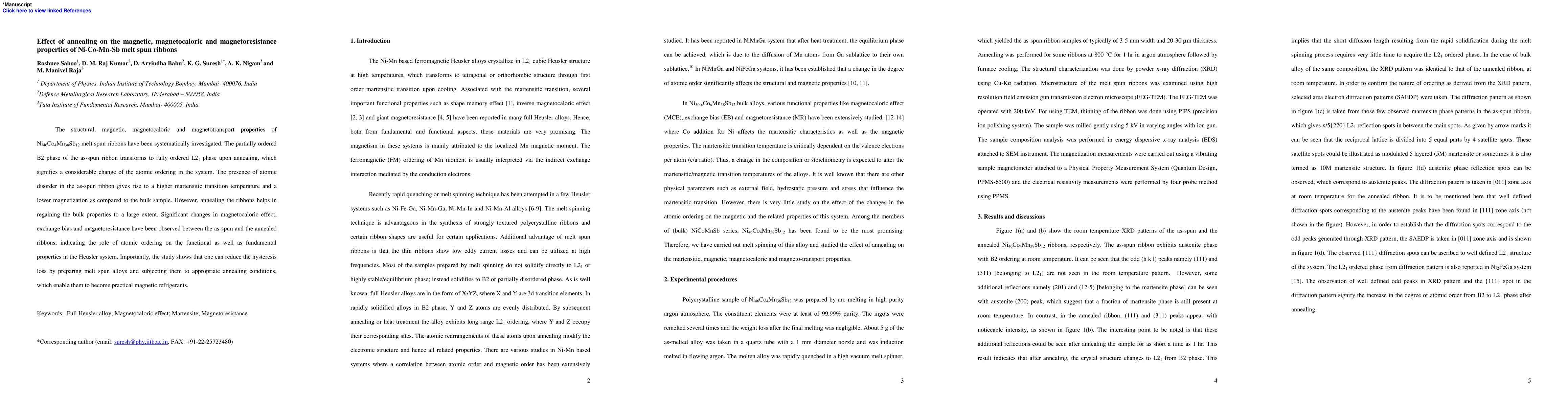 This study investigates the transformation of Ni-Co-Mn-Sb melt spun ribbons from an as-spun partially ordered B2 phase to a fully ordered L21 phase upon annealing, highlighting significant changes in magnetic, magnetocaloric, and magnetoresistance properties. The findings suggest that annealing can restore bulk properties and reduce hysteresis loss, making these materials practical for magnetic refrigeration applications.