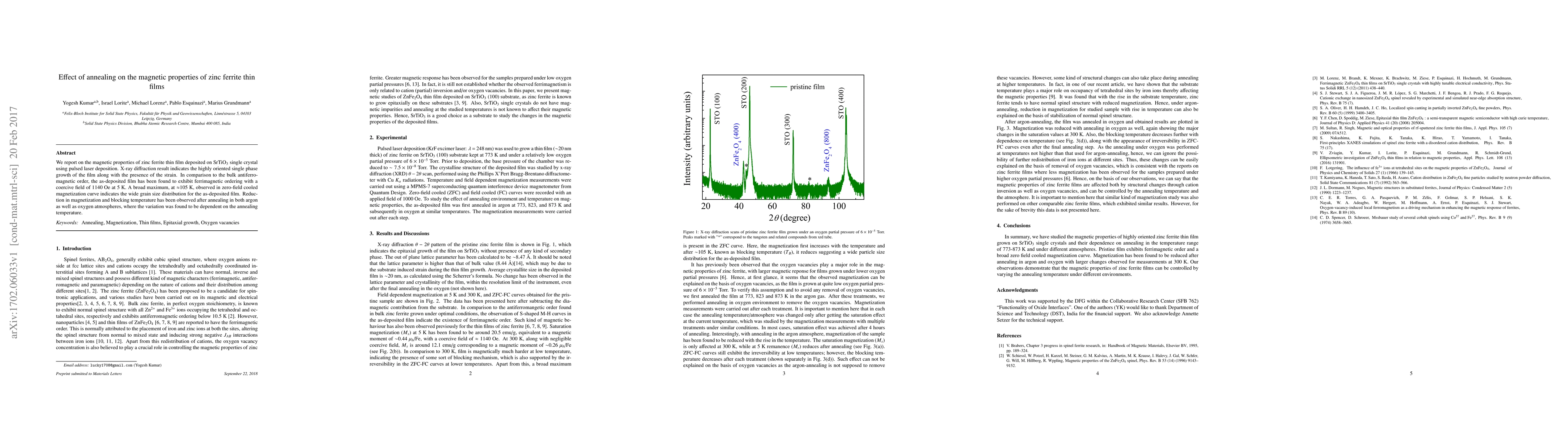 This study investigates the magnetic properties of zinc ferrite thin films deposited on SrTiO$_3$ via pulsed laser deposition, revealing ferrimagnetic ordering and a broad maximum in magnetization at 105 K. Annealing in argon and oxygen atmospheres reduces magnetization and blocking temperature, with effects varying with annealing temperature.