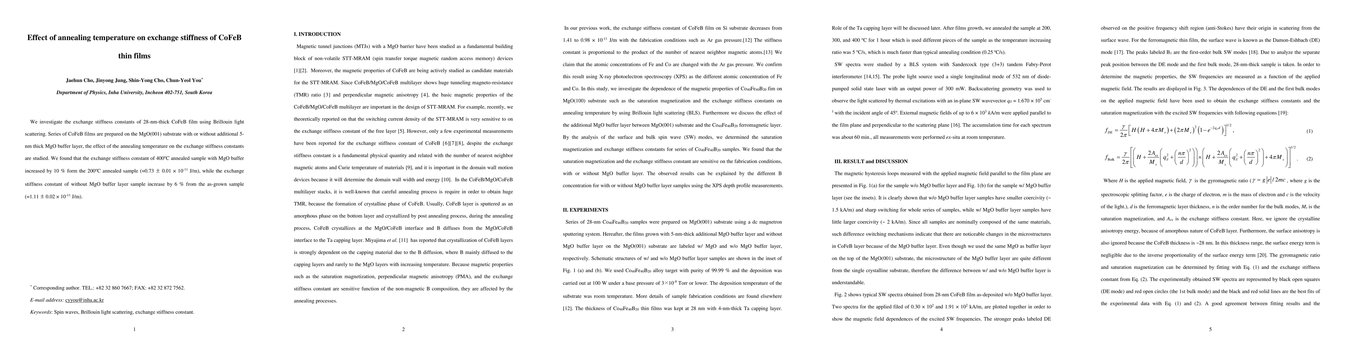 This study explores the impact of annealing temperature on the exchange stiffness constants of 28-nm-thick CoFeB films using Brillouin light scattering. Results show a 10% increase in exchange stiffness for 400°C annealed films with a MgO buffer compared to 200°C annealing, whereas films without the buffer layer showed a 6% increase.