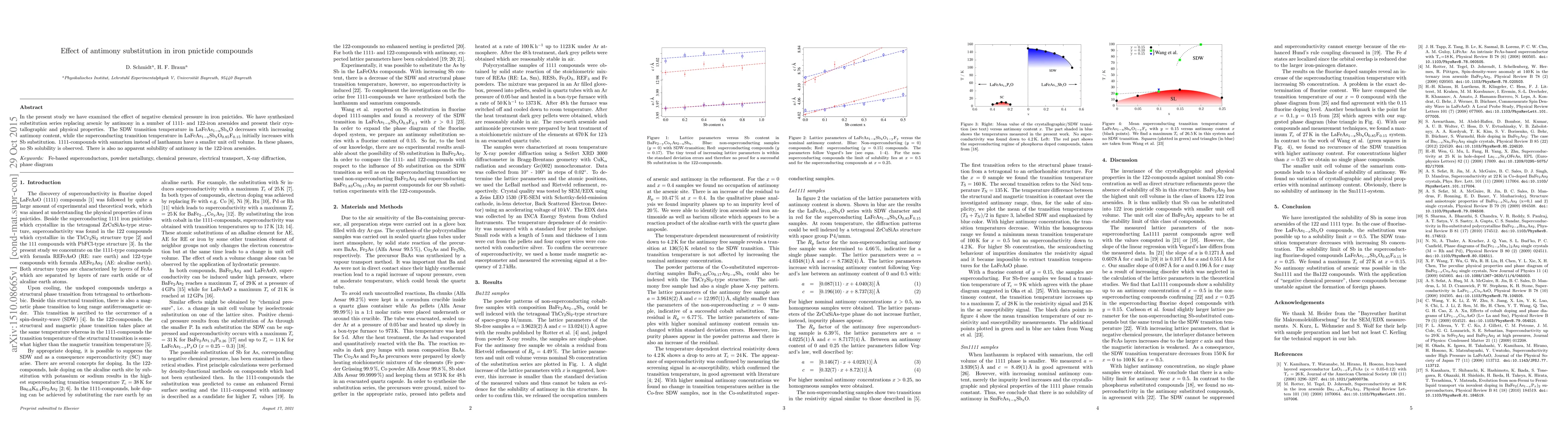 This study investigates the impact of antimony substitution for arsenic in iron pnictide compounds, revealing a decrease in spin-density wave transition temperature and an initial rise in superconducting transition temperature with increasing antimony content. No antimony solubility is observed in 1111-compounds with samarium and in 122-iron arsenides.