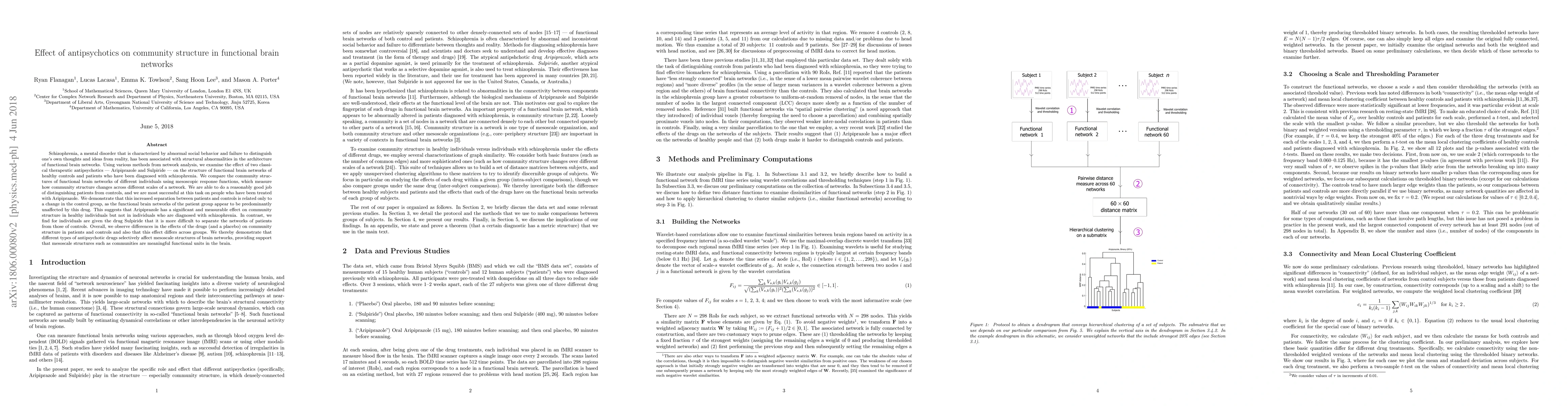 Schizophrenia, a mental disorder that is characterized by abnormal social behavior and failure to distinguish one's own thoughts and ideas from reality, has been associated with structural abnormalities in the architecture of functional brain networks. Using various methods from network analysis, we examine the effect of two classical therapeutic antipsychotics --- Aripiprazole and Sulpiride --- on the structure of functional brain networks of healthy controls and patients who have been diagnosed with schizophrenia. We compare the community structures of functional brain networks of different individuals using mesoscopic response functions, which measure how community structure changes across different scales of a network. We are able to do a reasonably good job of distinguishing patients from controls, and we are most successful at this task on people who have been treated with Aripiprazole. We demonstrate that this increased separation between patients and controls is related only to a change in the control group, as the functional brain networks of the patient group appear to be predominantly unaffected by this drug. This suggests that Aripiprazole has a significant and measurable effect on community structure in healthy individuals but not in individuals who are diagnosed with schizophrenia. In contrast, we find for individuals are given the drug Sulpiride that it is more difficult to separate the networks of patients from those of controls. Overall, we observe differences in the effects of the drugs (and a placebo) on community structure in patients and controls and also that this effect differs across groups. We thereby demonstrate that different types of antipsychotic drugs selectively affect mesoscale structures of brain networks, providing support that mesoscale structures such as communities are meaningful functional units in the brain.