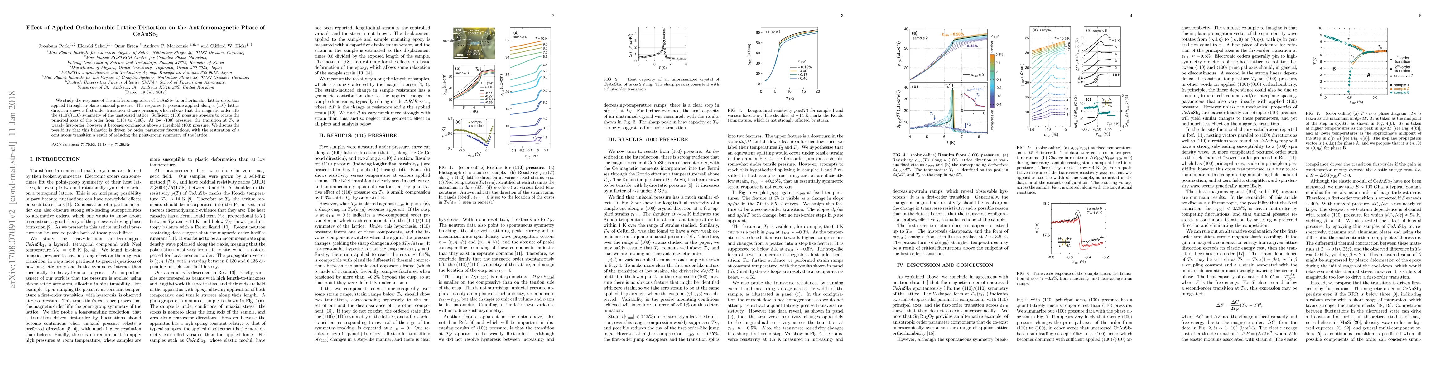 We study the response of the antiferromagnetism of CeAuSb$_2$ to orthorhombic lattice distortion applied through in-plane uniaxial pressure. The response to pressure applied along a $\langle 110 \rangle$ lattice direction shows a first-order transition at zero pressure, which shows that the magnetic order lifts the $(110)/(1\bar{1}0)$ symmetry of the unstressed lattice. Sufficient $\langle 100 \rangle$ pressure appears to rotate the principal axes of the order from $\langle 110 \rangle$ to $\langle 100 \rangle$. At low $\langle 100 \rangle$ pressure, the transition at $T_N$ is weakly first-order, however it becomes continuous above a threshold $\langle 100 \rangle$ pressure. We discuss the possibility that this behavior is driven by order parameter fluctuations, with the restoration of a continuous transition a result of reducing the point-group symmetry of the lattice.