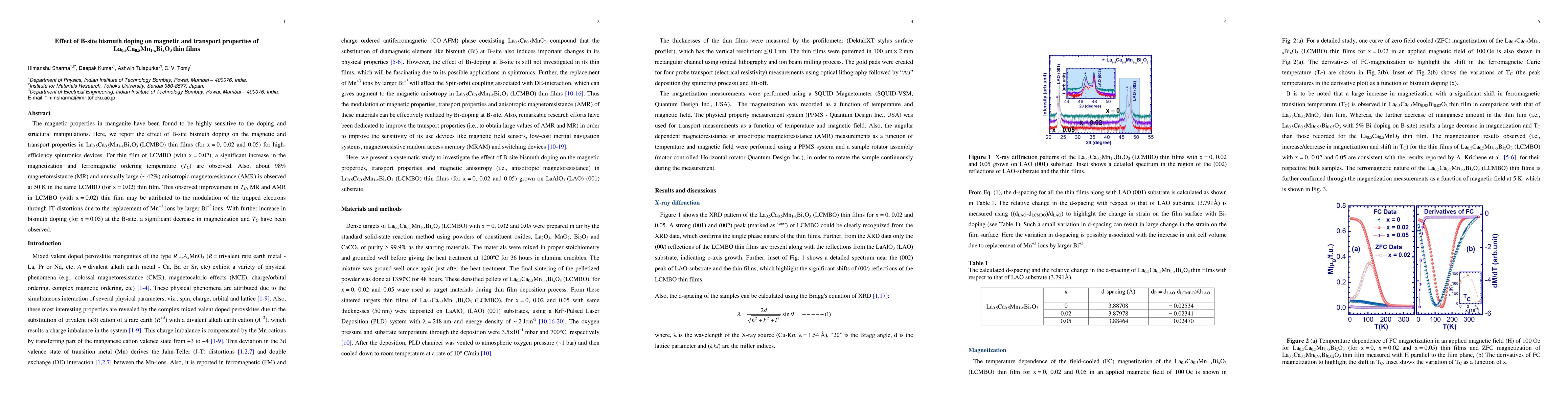 This study investigates how bismuth doping at the B-site affects the magnetic and transport properties of La0.5Ca0.5Mn1-xBixO3 thin films, finding a peak in performance at x = 0.02 with enhanced magnetization, TC, magnetoresistance, and anisotropic magnetoresistance, while higher doping (x = 0.05) reduces these properties.
