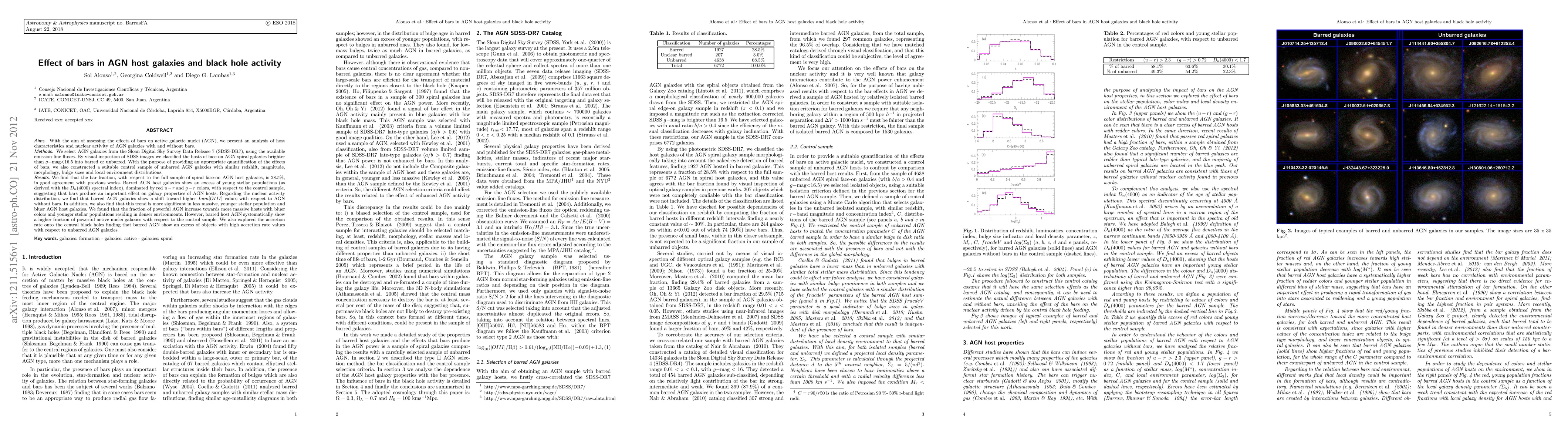With the aim of assessing the effects of bars on active galactic nuclei (AGN), we present an analysis of host characteristics and nuclear activity of AGN galaxies with and without bars selected from the Sloan Digital Sky Survey Data Release 7 (SDSS-DR7). By visual inspection of SDSS images we classified the hosts of face-on AGN spiral galaxies brighter than g < 16.5 into barred or unbarred. With the purpose of providing an appropriate quantification of the effects of bars, we also constructed a suitable control sample of unbarred AGN galaxies with similar redshift, magnitude, morphology, bulge sizes and local environment distributions. We find that the bar fraction, with respect to the full sample of spiral face-on AGN host galaxies, is 28.5%, in good agreement with previous works. Barred AGN host galaxies show an excess of young stellar populations dominated by red u-r and g-r colors, with respect to the control sample, suggesting that bars produce an important effect on galaxy properties of AGN hosts. Regarding the nuclear activity distribution, we find that barred AGN galaxies show a shift toward higher Lum[OIII] values with respect to AGN without bars. In addition, we also find that this trend is more significant in less massive, younger stellar population and bluer AGN host galaxies. We found that the fraction of powerful AGN increase towards more massive hosts with bluer colors and younger stellar populations residing in denser environments. However, barred host AGN systematically show a higher fraction of powerful active nuclei galaxies with respect to the control sample. We also explored the accretion rate onto the central black holes finding that barred AGN show an excess of objects with high accretion rate values with respect to unbarred AGN galaxies.