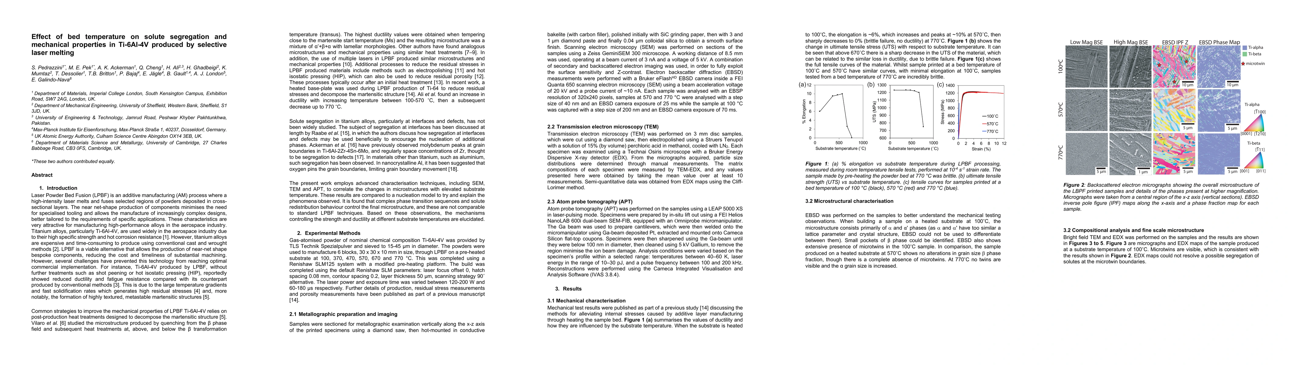 This study investigates the impact of substrate temperature on the mechanical properties and microstructure of Ti-6Al-4V produced by selective laser melting. Elevated temperatures initially increase ductility up to 570°C, then sharply reduce it at 770°C, correlating with changes in microstructure and solute segregation.