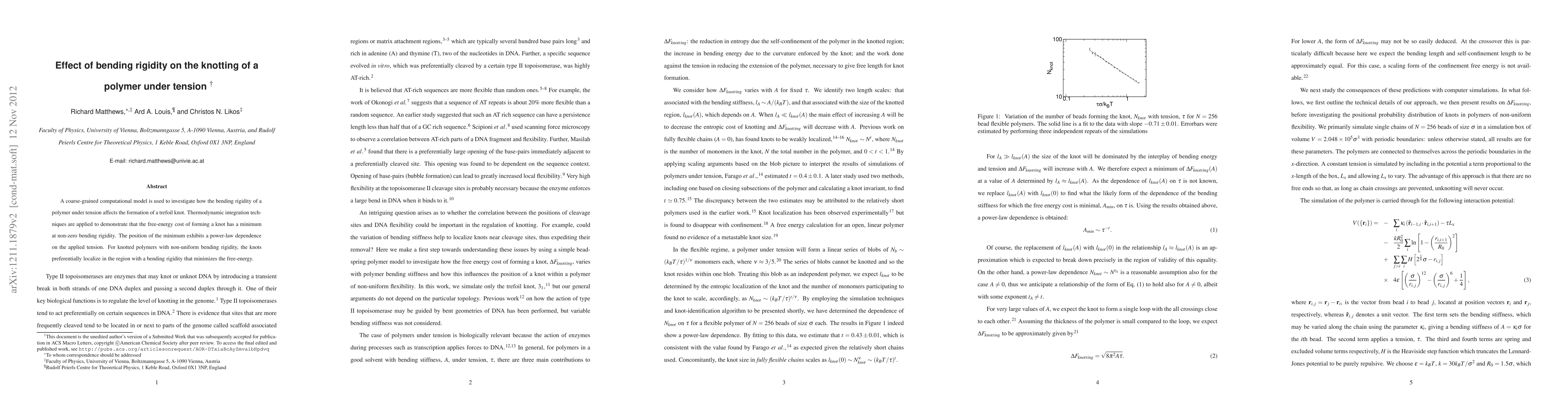 This study uses a coarse-grained computational model to explore how a polymer's bending rigidity influences knot formation under tension, revealing a minimum free-energy cost for knotting at non-zero bending rigidity, with the position of this minimum showing a power-law dependence on tension. Non-uniform bending rigidity in polymers causes knots to localize in regions minimizing free-energy.