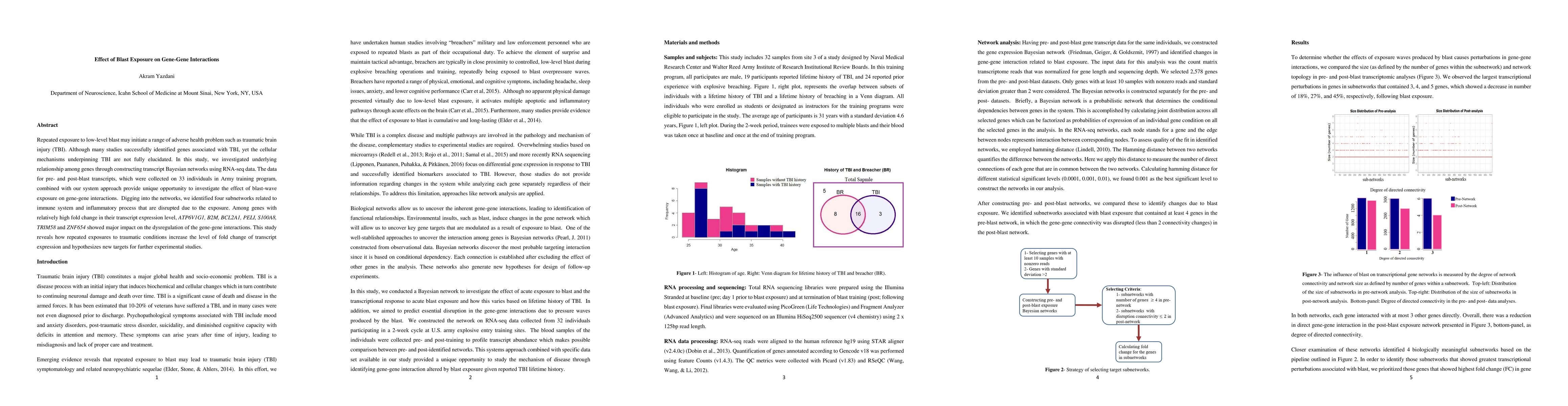 Repeated exposure to low-level blast may initiate a range of adverse health problem such as traumatic brain injury (TBI). Although many studies successfully identified genes associated with TBI, yet the cellular mechanisms underpinning TBI are not fully elucidated. In this study, we investigated underlying relationship among genes through constructing transcript Bayesian networks using RNA-seq data. The data for pre- and post-blast transcripts, which were collected on 33 individuals in Army training program, combined with our system approach provide unique opportunity to investigate the effect of blast-wave exposure on gene-gene interactions. Digging into the networks, we identified four subnetworks related to immune system and inflammatory process that are disrupted due to the exposure. Among genes with relatively high fold change in their transcript expression level, ATP6V1G1, B2M, BCL2A1, PELI, S100A8, TRIM58 and ZNF654 showed major impact on the dysregulation of the gene-gene interactions. This study reveals how repeated exposures to traumatic conditions increase the level of fold change of transcript expression and hypothesizes new targets for further experimental studies.