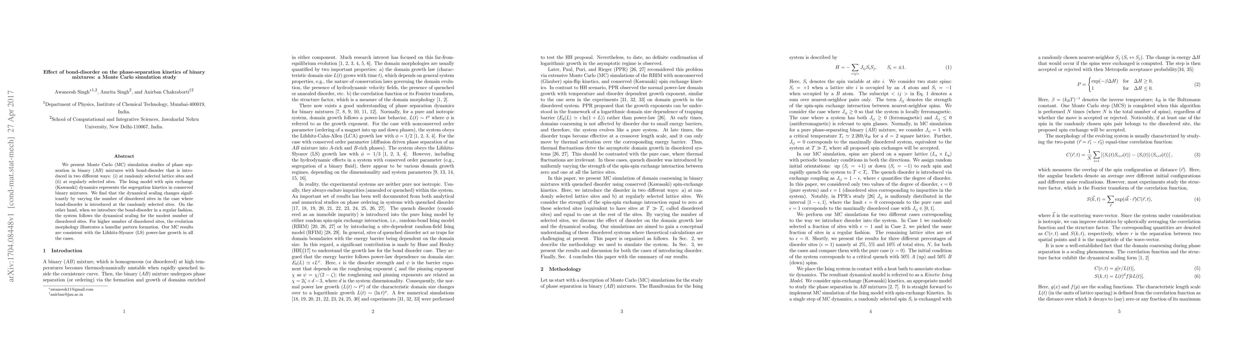 This paper uses Monte Carlo simulations to study the effect of bond-disorder on the phase separation kinetics in binary mixtures, finding significant changes in dynamical scaling when disorder is introduced randomly versus regularly. The results align with Lifshitz-Slyozov power-law growth, especially showing lamelllar pattern formation for higher disorder levels.