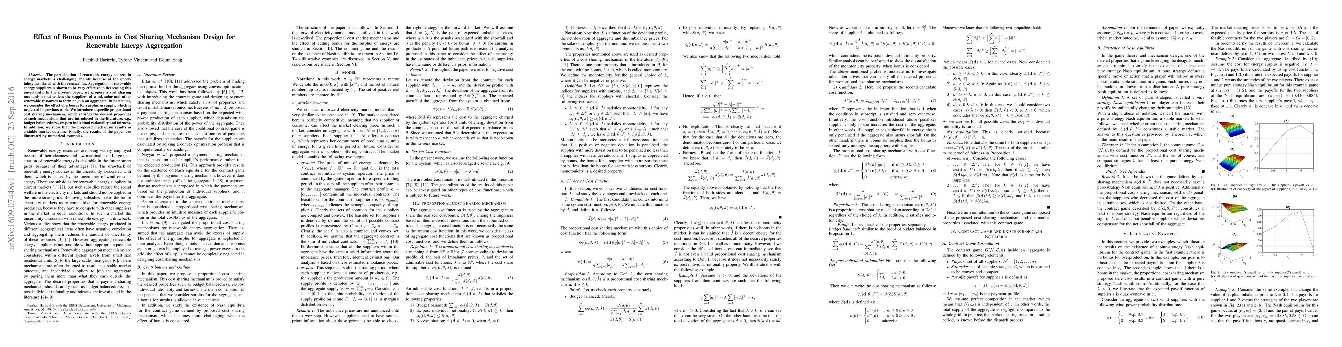 This paper proposes a cost sharing mechanism to incentivize renewable energy suppliers to aggregate, focusing on the effect of bonus payments for surplus supply. The introduced mechanism ensures budget balance, ex-post individual rationality, and fairness, leading to a stable market outcome, as demonstrated through numerical examples.