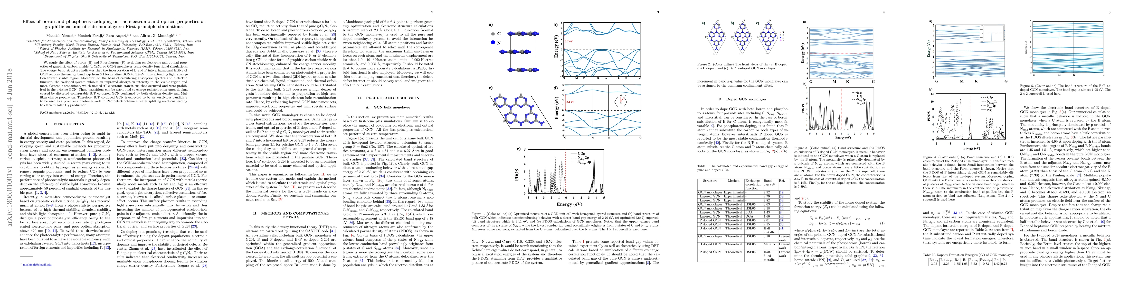 This study investigates the electronic and optical properties of boron and phosphorus co-doped graphitic carbon nitride monolayers via density functional simulations. The co-doping reduces the band gap and enhances visible light absorption, suggesting potential for efficient solar hydrogen production in photoelectrochemical water splitting.
