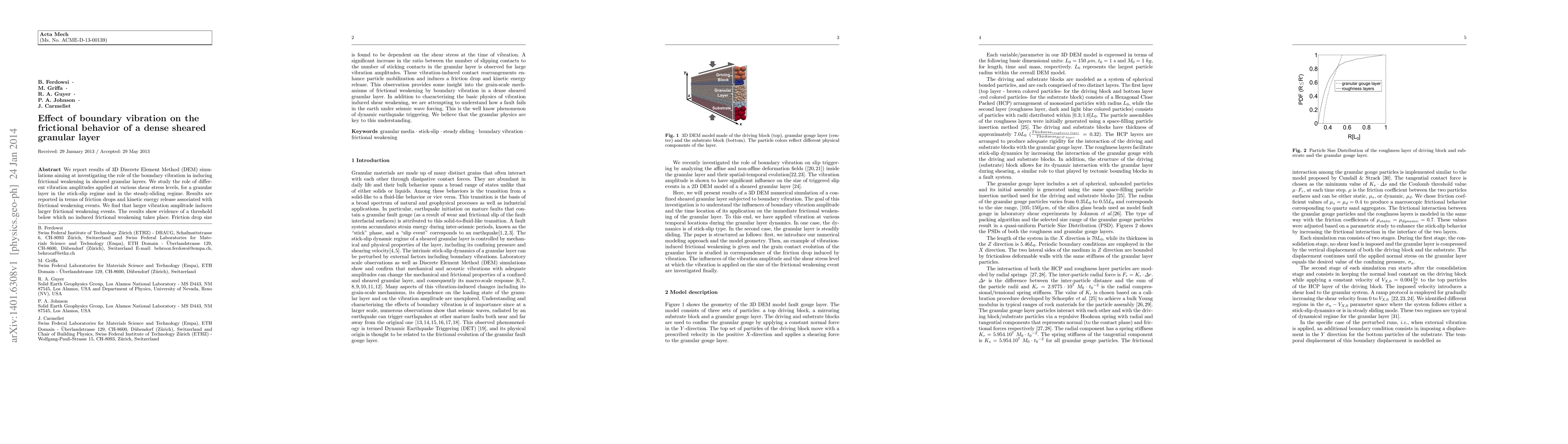This study uses 3D Discrete Element Method simulations to investigate how boundary vibration affects frictional behavior in dense sheared granular layers, finding that larger vibration amplitudes lead to greater frictional weakening and kinetic energy release, with a threshold below which no weakening occurs. The research sheds light on grain-scale mechanisms of dynamic earthquake triggering.