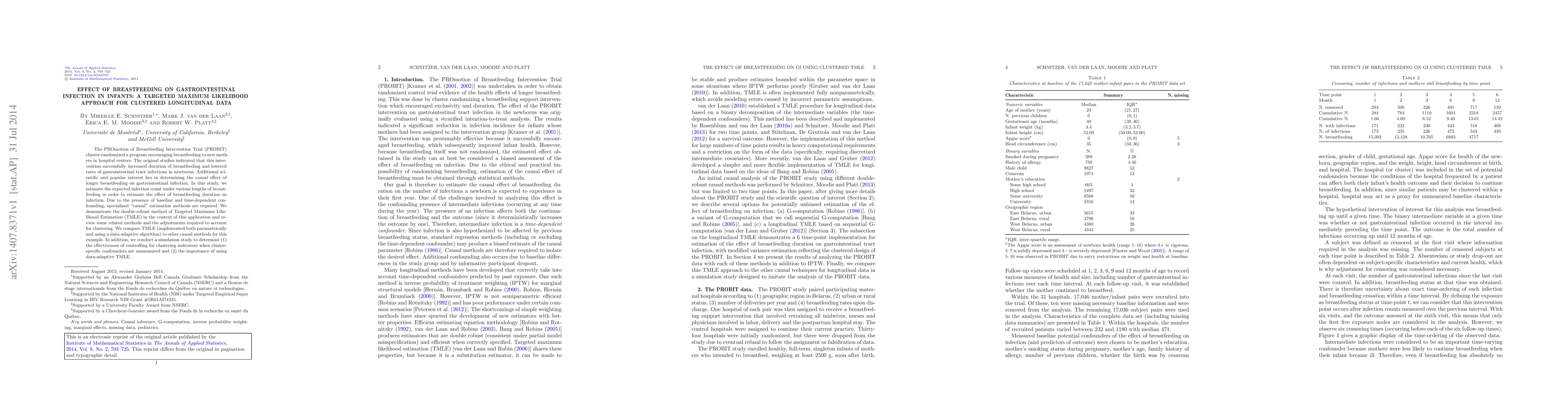 The PROmotion of Breastfeeding Intervention Trial (PROBIT) cluster-randomized a program encouraging breastfeeding to new mothers in hospital centers. The original studies indicated that this intervention successfully increased duration of breastfeeding and lowered rates of gastrointestinal tract infections in newborns. Additional scientific and popular interest lies in determining the causal effect of longer breastfeeding on gastrointestinal infection. In this study, we estimate the expected infection count under various lengths of breastfeeding in order to estimate the effect of breastfeeding duration on infection. Due to the presence of baseline and time-dependent confounding, specialized "causal" estimation methods are required. We demonstrate the double-robust method of Targeted Maximum Likelihood Estimation (TMLE) in the context of this application and review some related methods and the adjustments required to account for clustering. We compare TMLE (implemented both parametrically and using a data-adaptive algorithm) to other causal methods for this example. In addition, we conduct a simulation study to determine (1) the effectiveness of controlling for clustering indicators when cluster-specific confounders are unmeasured and (2) the importance of using data-adaptive TMLE.