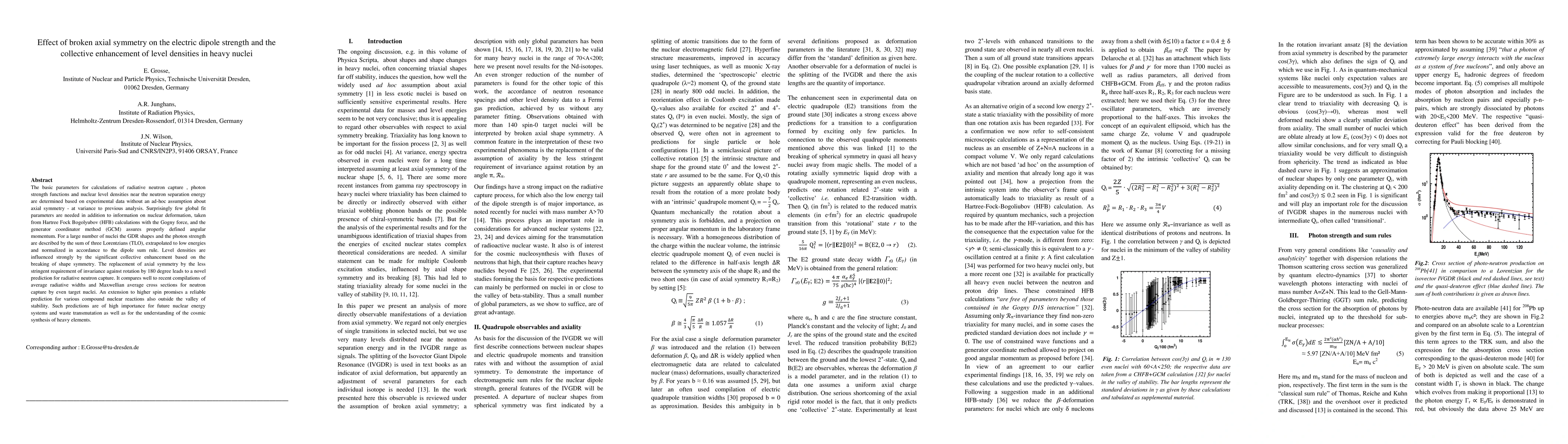 The basic parameters for calculations of radiative neutron capture , photon strength functions and nuclear level densities near the neutron separation energy are determined based on experimental data without an ad-hoc assumption about axial symmetry - at variance to previous analysis. Surprisingly few global fit parameters are needed in addition to information on nuclear deformation, taken from Hartree Fock Bogolyubov (HFB) calculations with the Gogny force, and the generator coordinator method (GCM) assures properly defined angular momentum. For a large number of nuclei the GDR shapes and the photon strength are described by the sum of three Lorentzians (TLO), extrapolated to low energies and normalized in accordance to the dipole sum rule. Level densities are influenced strongly by the significant collective enhancement based on the breaking of shape symmetry. The replacement of axial symmetry by the less stringent requirement of invariance against rotation by 180 degree leads to a novel prediction for radiative neutron capture. It compares well to recent compilations of average radiative widths and Maxwellian average cross sections for neutron capture by even target nuclei. An extension to higher spin promises a reliable prediction for various compound nuclear reactions also outside the valley of stability. Such predictions are of high importance for future nuclear energy systems and waste transmutation as well as for the understanding of the cosmic synthesis of heavy elements.
