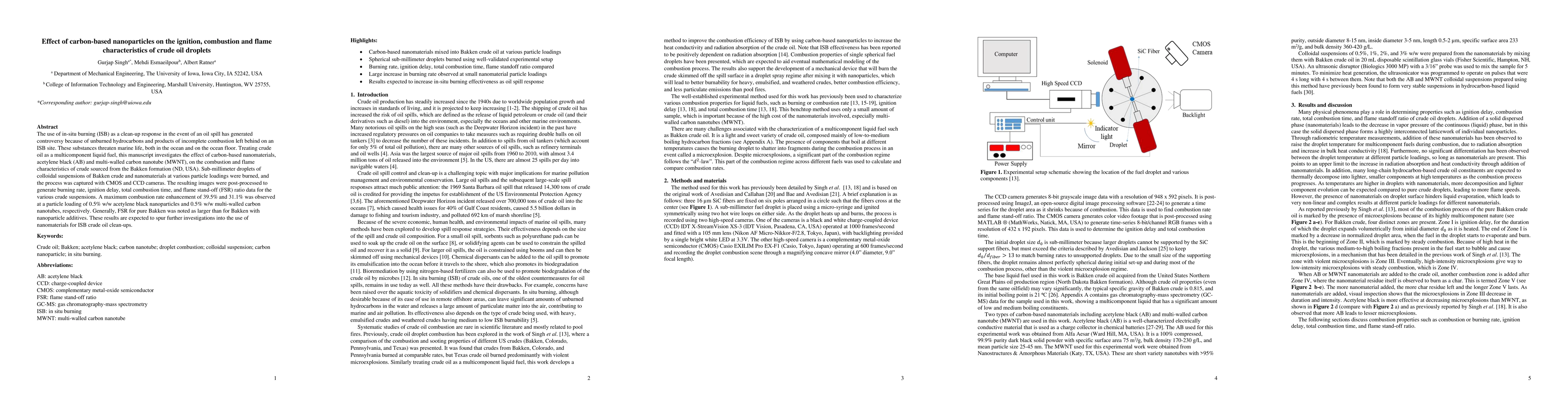 This study examines how carbon-based nanoparticles, specifically acetylene black and multi-walled carbon nanotubes, affect the ignition, combustion, and flame characteristics of Bakken crude oil droplets during in-situ burning. The research found significant improvements in combustion rates and reductions in flame stand-off ratios, suggesting potential benefits for cleaner oil spill clean-ups.