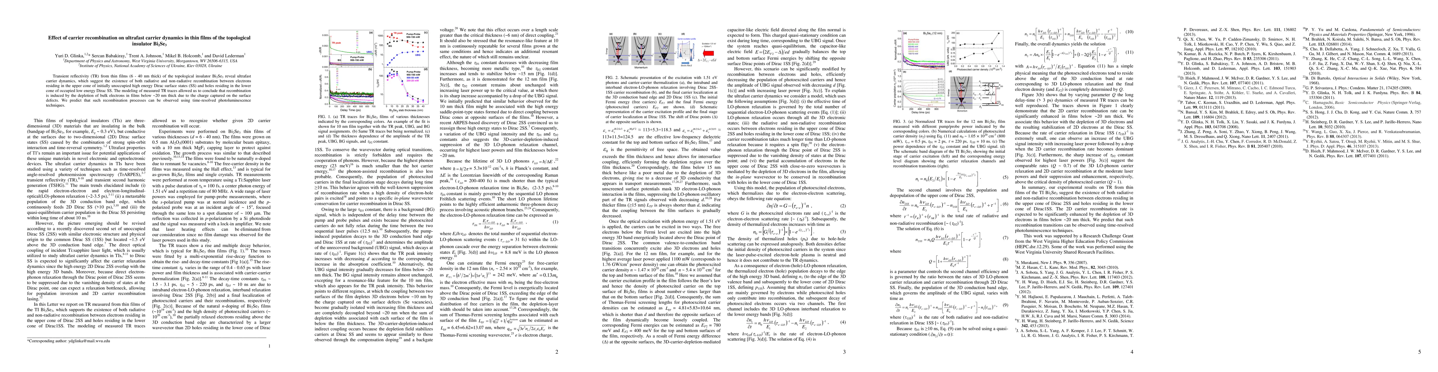 This study reveals ultrafast carrier dynamics in Bi2Se3 thin films via transient reflectivity, indicating radiative and non-radiative recombination in Dirac surface states. Modeling suggests recombination is driven by surface defect-induced depletion of bulk electrons in films thinner than ~20 nm.