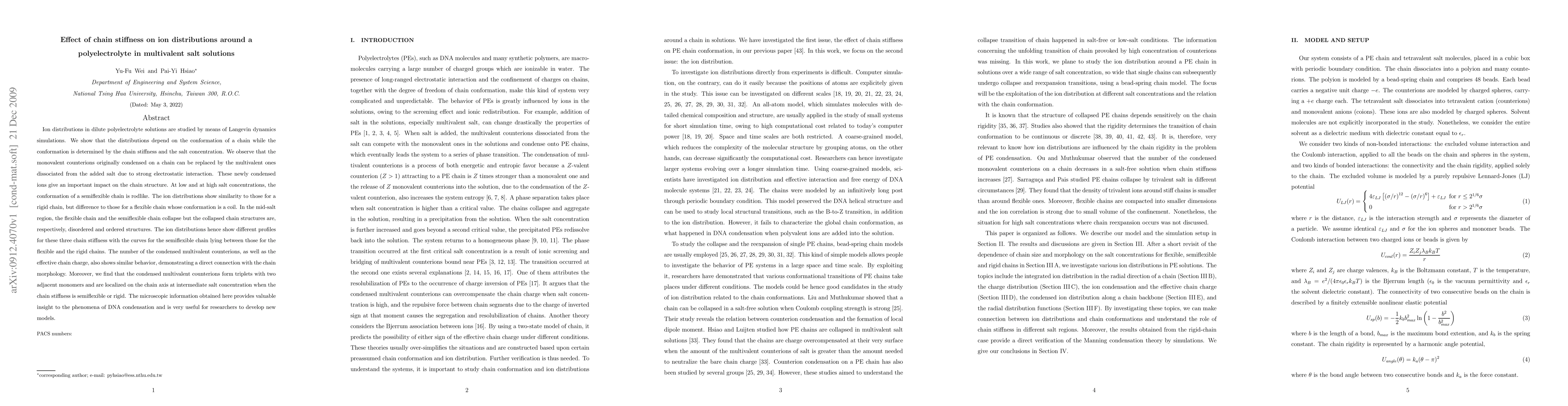 This study uses Langevin dynamics simulations to investigate how ion distributions around polyelectrolyte chains are influenced by the chain's stiffness and salt concentration. The research reveals that multivalent counterions replace monovalent ones due to strong electrostatic interactions, leading to distinct ion distribution profiles depending on the chain's stiffness, with implications for understanding DNA condensation and developing new theoretical models.