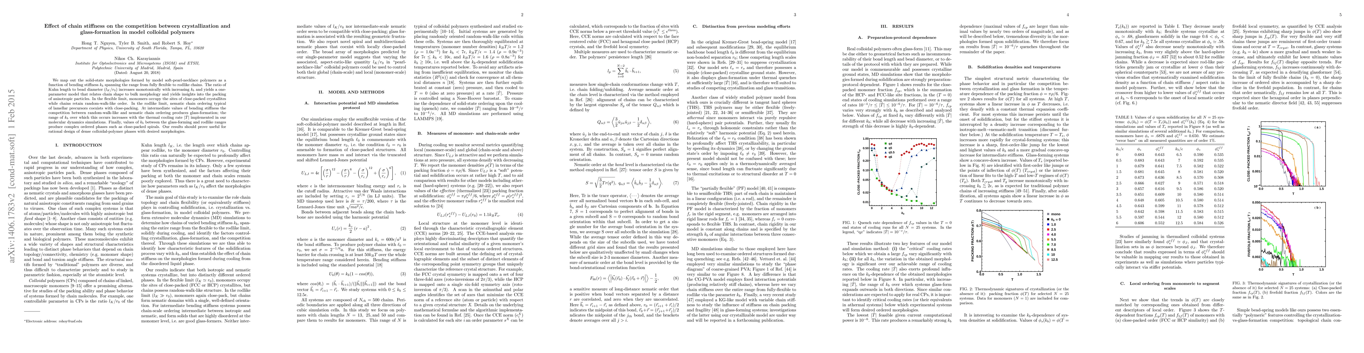 We map out the solid-state morphologies formed by model soft-pearl-necklace polymers as a function of bending stiffness $k_b$ spanning the range from fully flexible to rodlike chains. The ratio of Kuhn length to bead diameter ($l_K/r_0$) increases monotonically with increasing $k_b$ and yields a one-parameter model that relates chain shape to bulk morphology and yields insights into the packing of anisotropic particles. In the flexible limit, monomers occupy the sites of close-packed crystallites while chains retain random-walk-like order. In the rodlike limit, nematic chain ordering typical of lamellar precursors coexists with close-packing. At intermediate values of bending stiffness the competition between random-walk-like and nematic chain ordering produces glass-formation; the range of $k_b$ over which this occurs increases with the thermal cooling rate $|\dot{T}|$ implemented in our molecular dynamics simulations. Finally, values of $k_b$ between the glass-forming and rodlike ranges produce complex ordered phases such as close-packed spirals. Our results should prove useful for rational design of dense colloidal-polymer phases with desired morphologies.