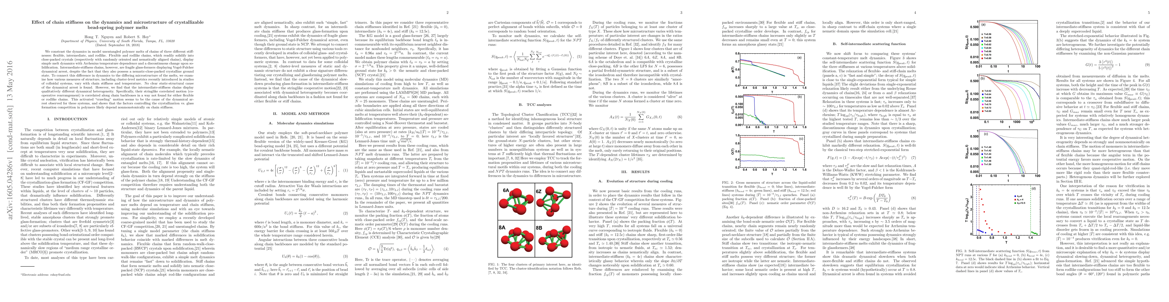 This study investigates how varying chain stiffness in unentangled polymer melts affects their dynamics and microstructure. Flexible and rodlike chains show simple melt dynamics and crystallize, while intermediate-stiffness chains exhibit fragile glass-forming behavior with dynamical arrest. The latter's unique cooperative "crawling" motion along chain backbones is identified as the cause of this arrest, suggesting a complex relationship between chain stiffness and polymer crystallization vs. glass formation.