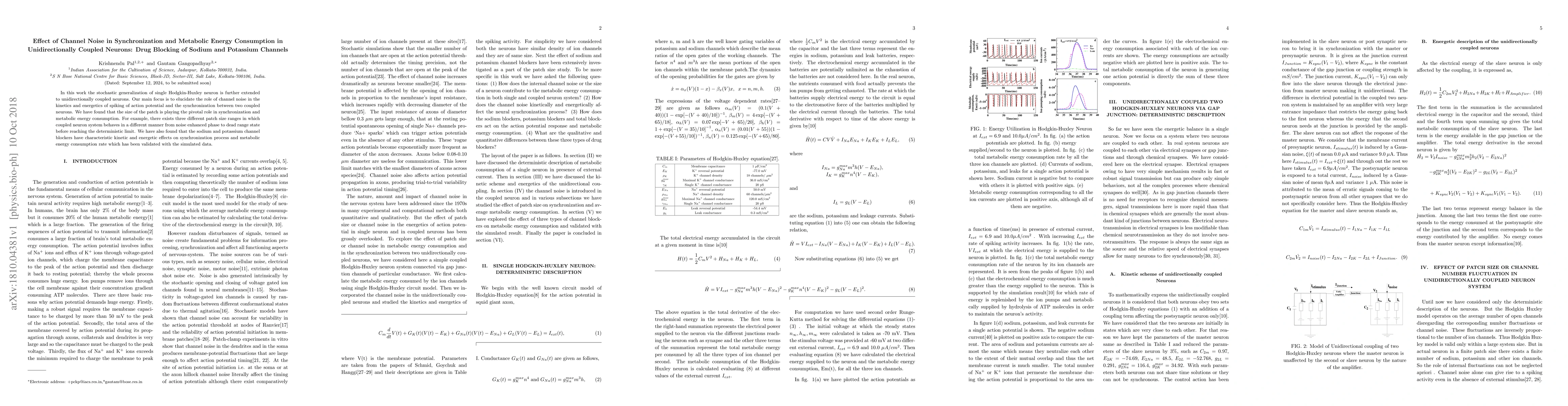 In this work the stochastic generalization of single Hodgkin-Huxley neuron is further extended to unidirectionally coupled neurons. Our main focus is to elucidate the role of channel noise in the kinetics and energetics of spiking of action potential and the synchronization between two coupled neurons. We have found that the size of the patch is playing the pivotal role in synchronization and metabolic energy consumption. For example, there exists three different patch size ranges in which coupled neuron system behaves in a different manner from noise enhanced phase to dead range state before reaching the deterministic limit. We have also found that the sodium and potassium channel blockers have characteristic kinetic and energetic effects on synchronization process and metabolic energy consumption rate which has been validated with the simulated data.