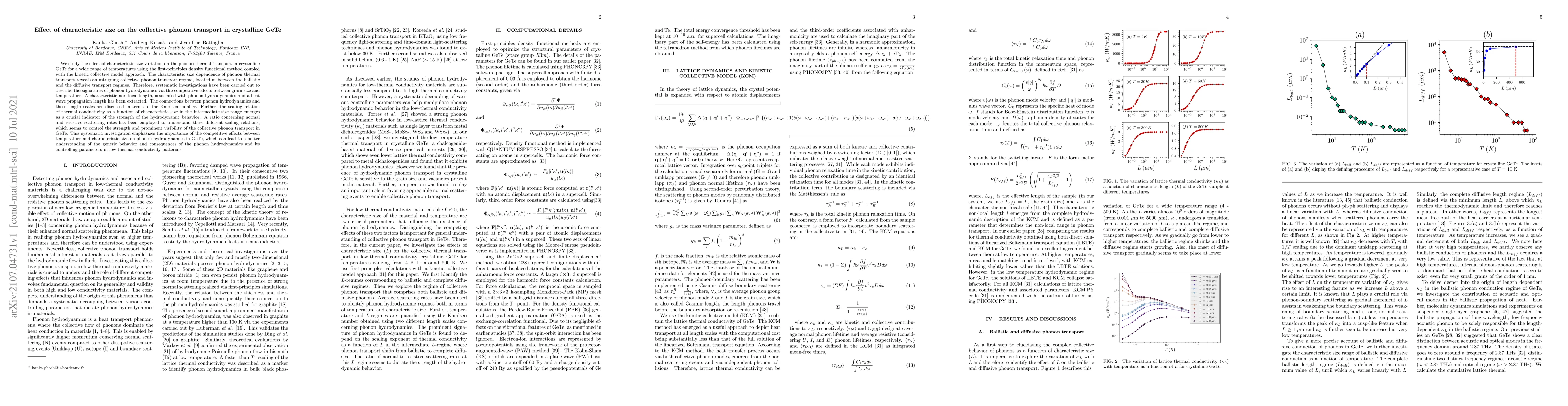 This study investigates the effect of characteristic size on phonon thermal transport in crystalline GeTe using first-principles density-functional theory, revealing a regime between ballistic and diffusive transport. The research identifies a characteristic nonlocal length linked to phonon hydrodynamics and discusses its connection to the Knudsen number, emphasizing the significance of size and temperature interplay on phonon transport behavior in GeTe.