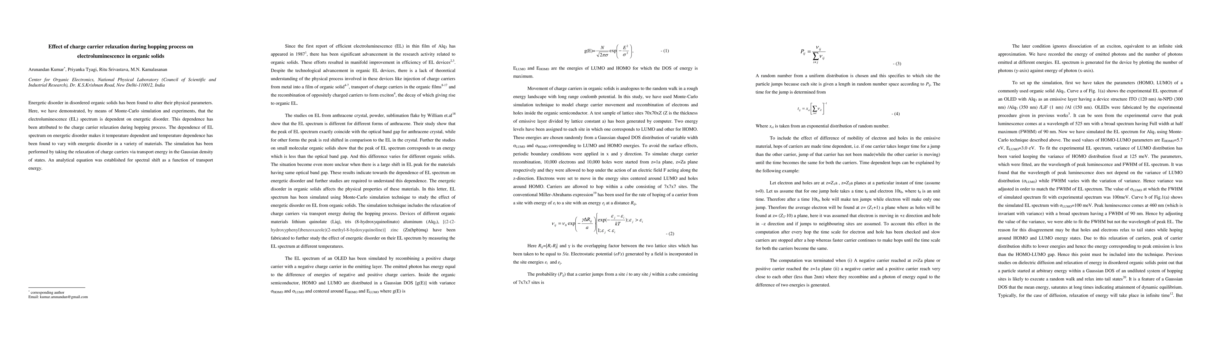 This paper demonstrates that energetic disorder in organic solids affects electroluminescence (EL) spectrum due to charge carrier relaxation during hopping, making EL temperature-dependent. Monte-Carlo simulations and experiments show that the EL spectrum's dependence on disorder varies across materials, with an analytical equation established for the spectral shift related to transport energy.