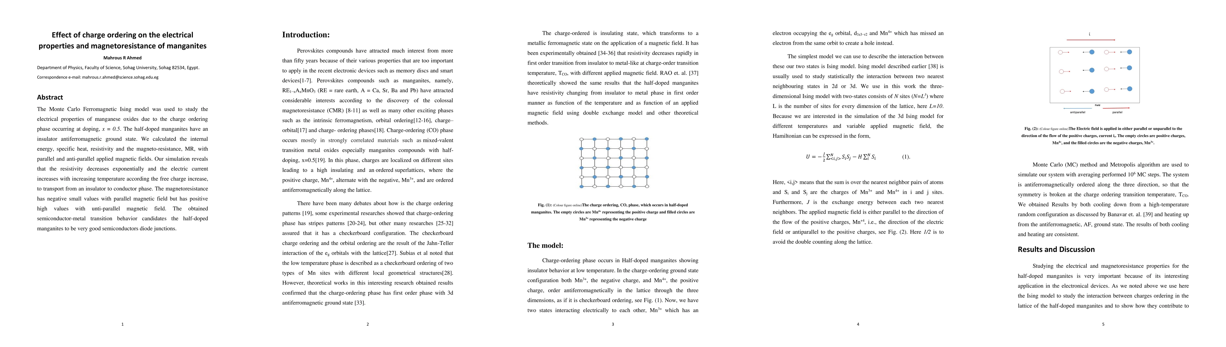 This study uses the Monte Carlo Ferromagnetic Ising model to analyze electrical properties of half-doped manganites, revealing an insulator-to-conductor transition with temperature increase. Magnetoresistance shows negative values with parallel fields and positive high values with anti-parallel fields, suggesting potential for high-performance semiconductor diode junctions.