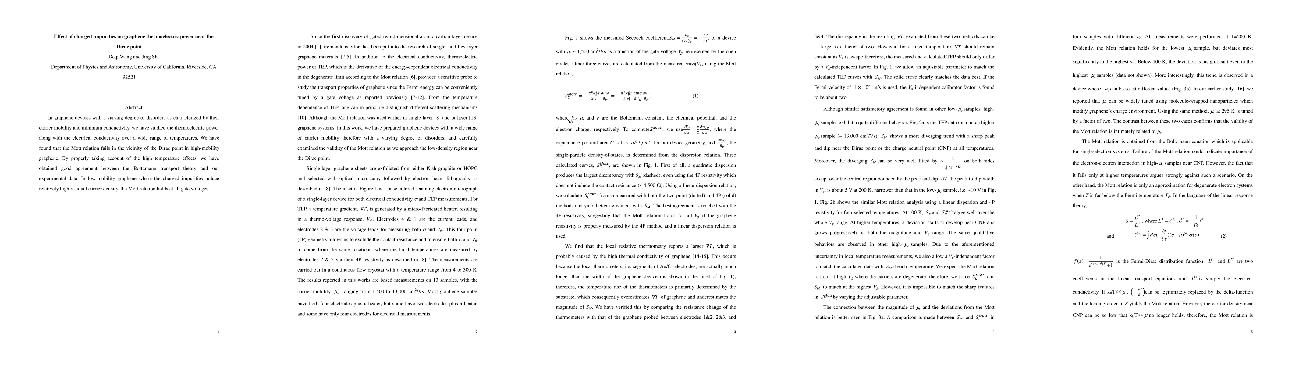 Summary: This study investigates the thermoelectric power in graphene with varying disorder levels and finds that the Mott relation does not apply near the Dirac point in high-mobility graphene. In contrast, the Mott relation holds in low-mobility graphene due to the influence of charged impurities.