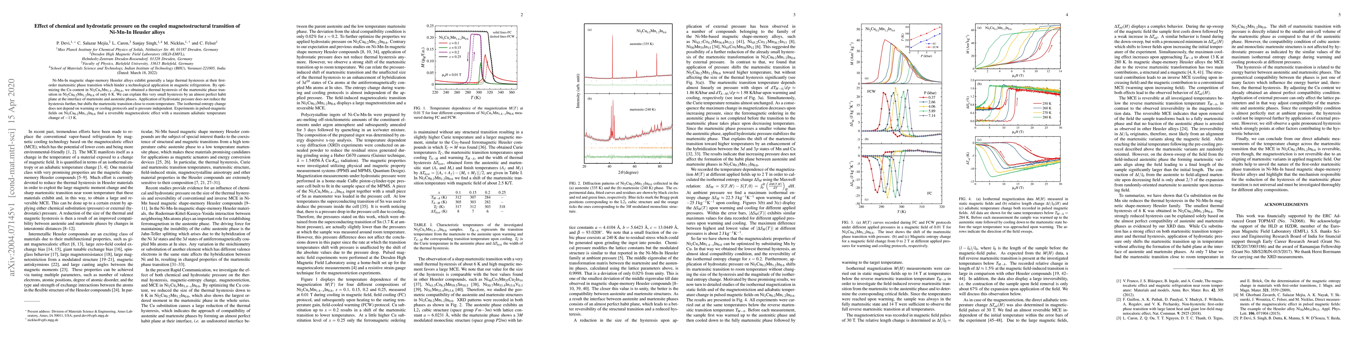 This study investigates how chemical composition and hydrostatic pressure affect the magnetostructural transition in Ni-Mn-In Heusler alloys, achieving a minimal thermal hysteresis of 6 K in optimized Ni$_2$Cu$_{0.2}$Mn$_{1.2}$In$_{0.6}$ and demonstrating a reversible magnetocaloric effect with a significant adiabatic temperature change.