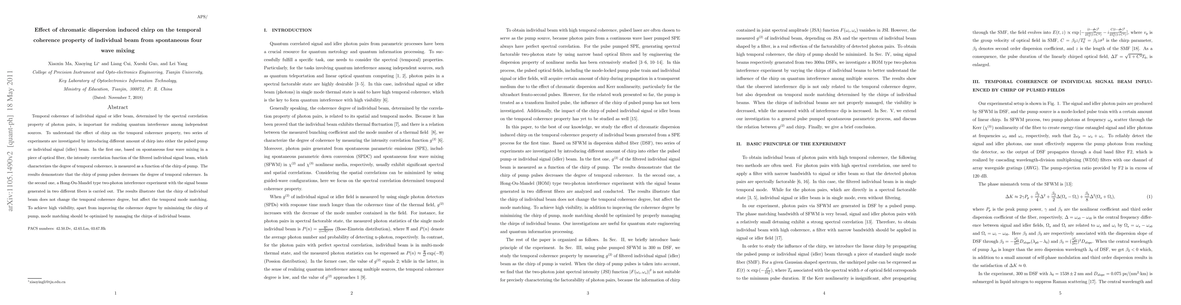 Temporal coherence of individual signal or idler beam, determined by the spectral correlation property of photon pairs, is important for realizing quantum interference among independent sources. To understand the effect of chirp on the temporal coherence property, two series of experiments are investigated by introducing different amount of chirp into either the pulsed pump or individual signal (idler) beam. In the first one, based on spontaneous four wave mixing in a piece of optical fiber, the intensity correlation function of the filtered individual signal beam, which characterizes the degree of temporal coherence, is measured as a function of the chirp of pump. The results demonstrate that the chirp of pump pulses decreases the degree of temporal coherence. In the second one, a Hong-Ou-Mandel type two-photon interference experiment with the signal beams generated in two different fibers is carried out. The results illustrate that the chirp of individual beam does not change the temporal coherence degree, but affect the temporal mode matching. To achieve high visibility, apart from improving the coherence degree by minimizing the chirp of pump, mode matching should be optimized by managing the chirps of individual beams.