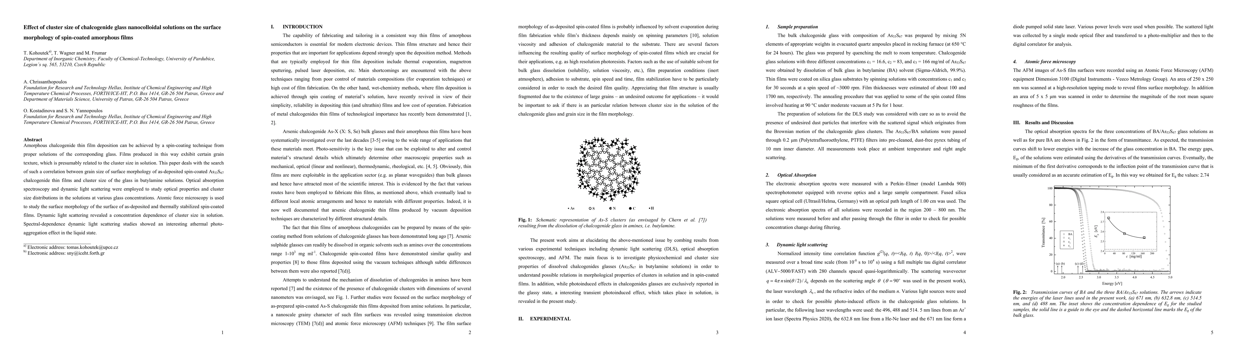Amorphous chalcogenide thin film deposition can be achieved by a spin-coating technique from proper solutions of the corresponding glass. Films produced in this way exhibit certain grain texture, which is presumably related to the cluster size in solution. This paper deals with the search of such a correlation between grain size of surface morphology of as-deposited spin-coated As33S67 chalcogenide thin films and cluster size of the glass in butylamine solutions. Optical absorption spectroscopy and dynamic light scattering were employed to study optical properties and cluster size distributions in the solutions at various glass concentrations. Atomic force microscopy is used to study the surface morphology of the surface of as-deposited and thermally stabilized spin-coated films. Dynamic light scattering revealed a concentration dependence of cluster size in solution. Spectral-dependence dynamic light scattering studies showed an interesting athermal photo-aggregation effect in the liquid state.