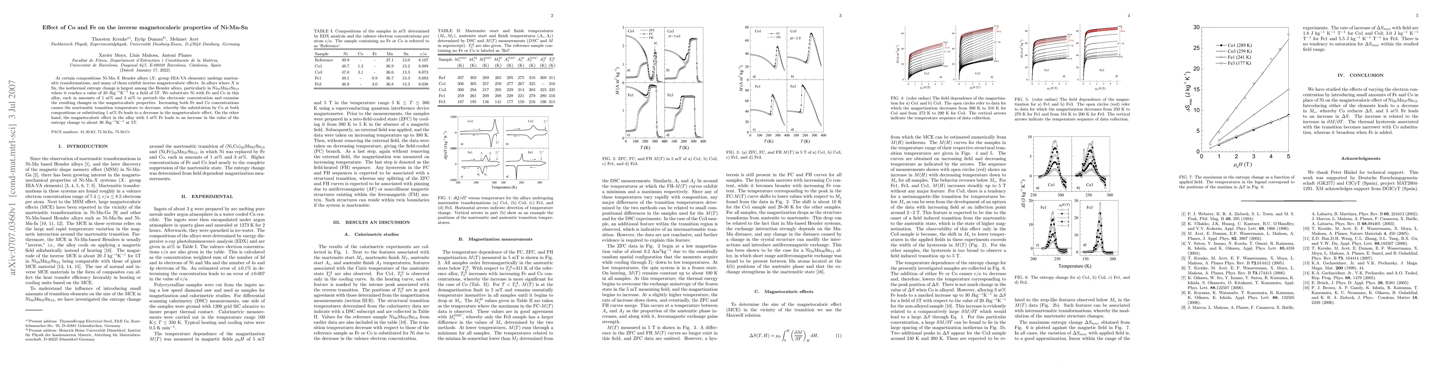 This study investigates the effect of substituting Ni with Fe and Co in Ni-Mn-Sn Heusler alloys, finding that both Fe and Co substitutions lower the martensitic transition temperature. While Co and 1 at% Fe reduce the magnetocaloric effect, 3 at% Fe increases the entropy change to 30 Jkg$^{-1}$K$^{-1}$ at 5T.