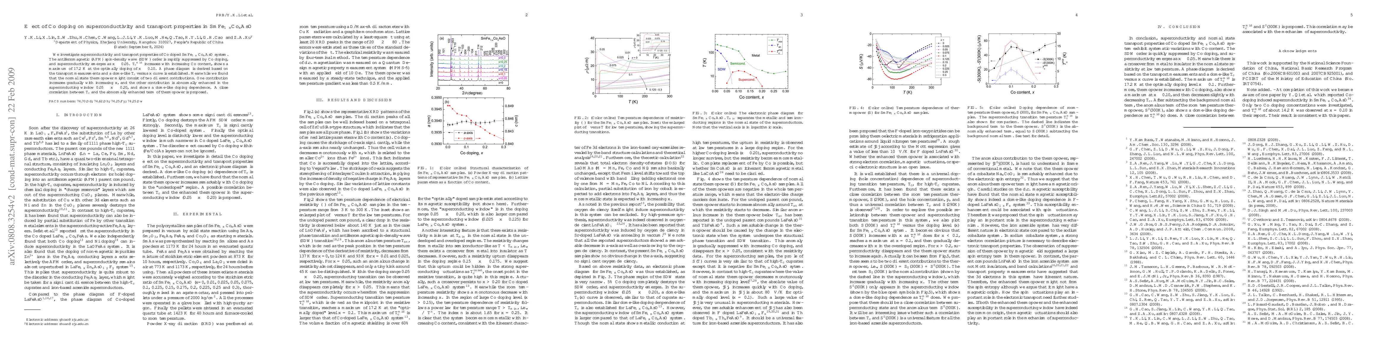 Co doping suppresses antiferromagnetic order in SmFeAsO, enabling superconductivity above 17.2 K at optimal doping levels, and altering thermopower properties.