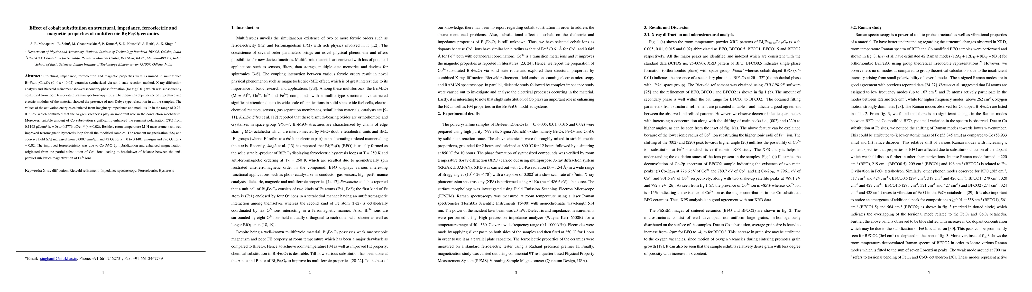 The research investigates the impact of cobalt substitution on Bi_2Fe_4O_9 ceramics, revealing secondary phase formation for x >= 0.01. It finds that suitable Co substitution enhances remnant polarization and ferromagnetic hysteresis loop, attributed to Co 3d-O 2p hybridization and increased magnetization due to Co^3+ ion substitution.