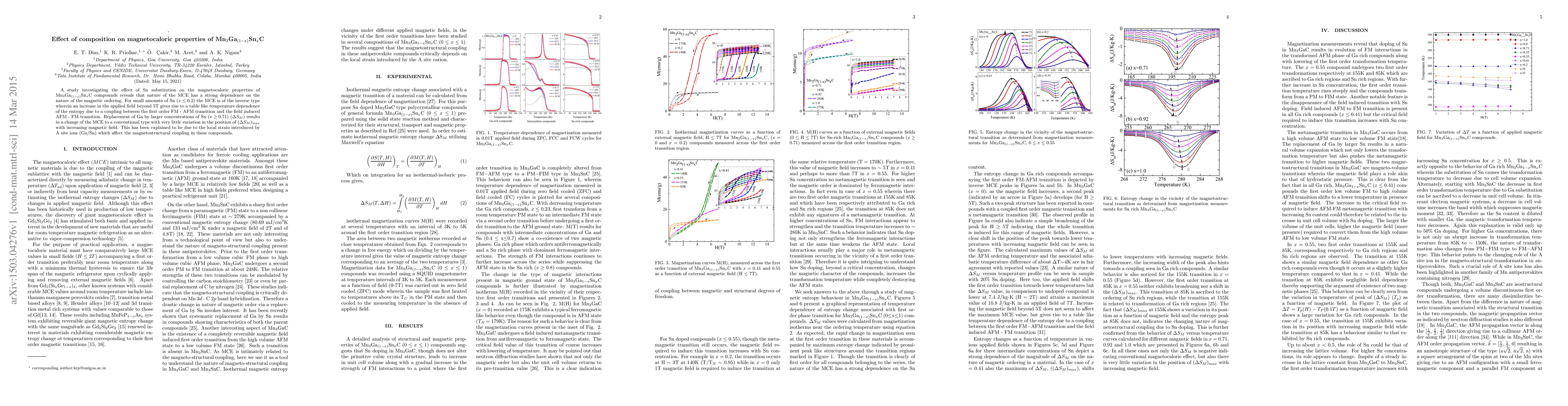 A study investigating the effect of Sn substitution on the magnetocaloric properties of Mn$ _{3} $Ga$ _{(1-x)} $Sn$ _{x} $C compounds reveals that nature of the MCE has a strong dependence on the nature of the magnetic ordering. For small amounts of Sn ($ x\leq0.2 $) the MCE is of the inverse type wherein an increase in the applied field beyond 5T gives rise to a table like temperature dependence of the entropy due to a coupling between the first order FM - AFM transition and the field induced AFM - FM transition. Replacement of Ga by larger concentrations of Sn ($ x\geq0.71 $) $(\Delta S_M)$ results in a change of the MCE to a conventional type with very little variation in the position of $(\Delta S_M)_{max}$ with increasing magnetic field. This has been explained to be due to the local strain introduced by A site ions (Ga/Sn) which affect the magnetostructural coupling in these compounds.